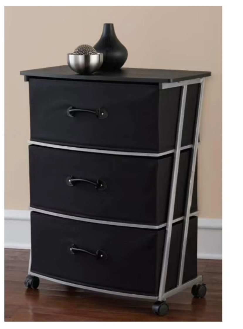 MAINSTAYS 3-Drawer Wide Fabric Cart, wood top shelf with 3 fabric drawers, stylish silver metal frame, black fabric color. Size 22.34 inch W x 12 inch D x 29.75 inch H New - $30 Need to ensemble - instructions included. Missing original box.