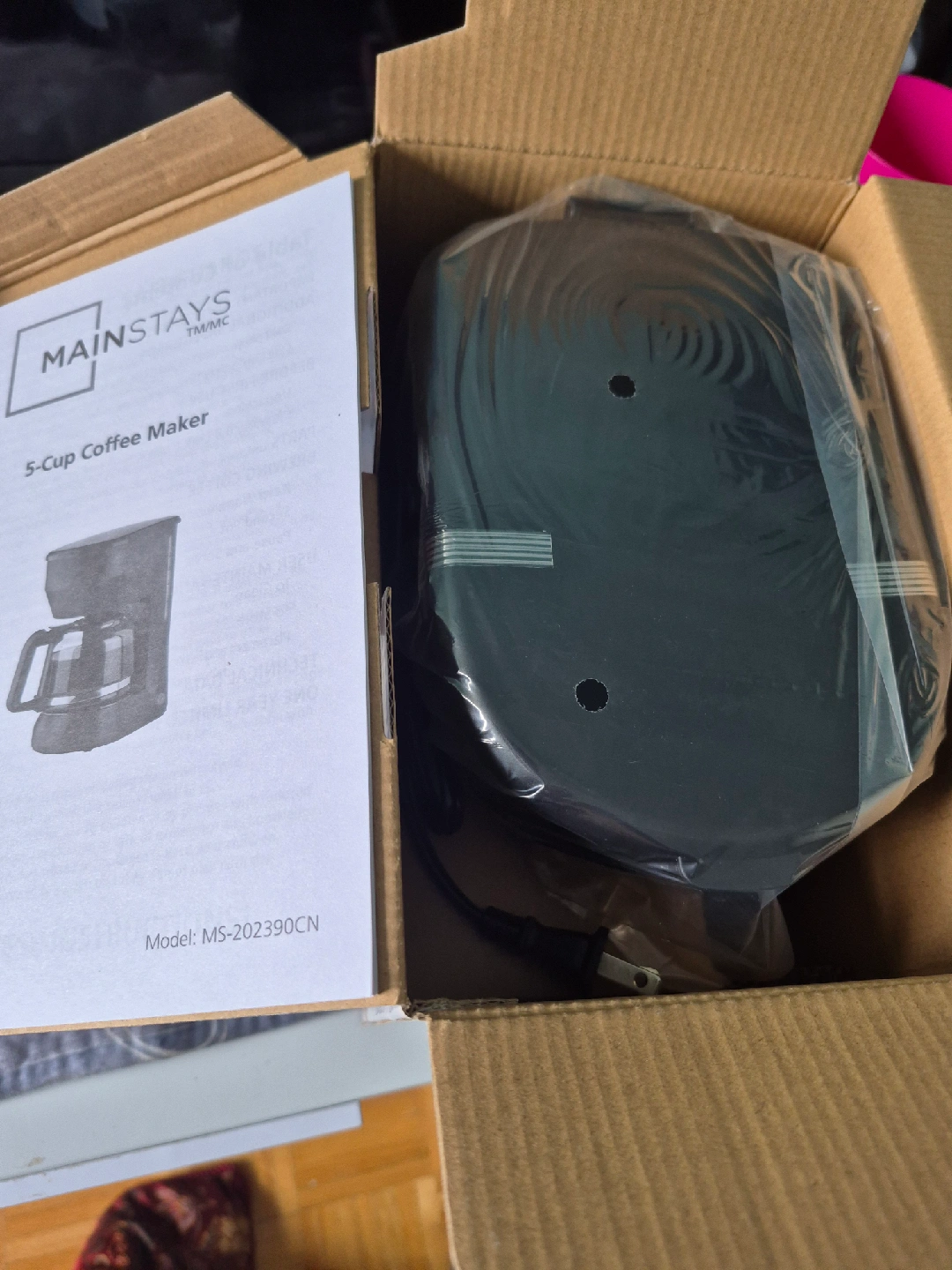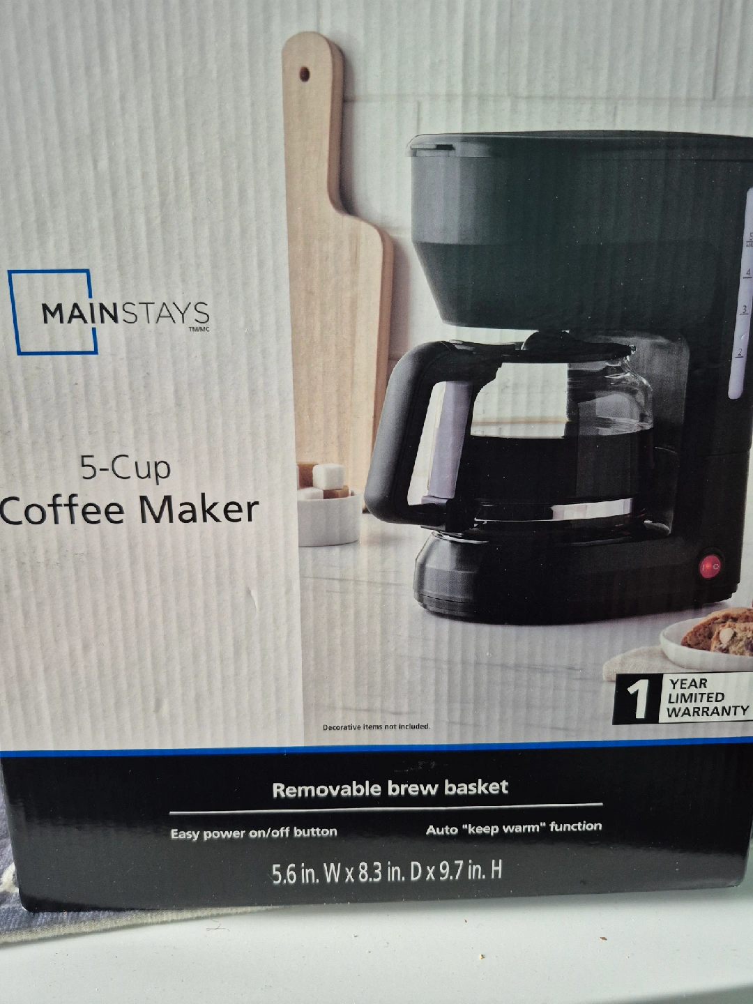 Selling a brand new Mainstays 5-Cup Coffee Maker still in its original box! It features a removable brew basket and easy power on/off button. It also has an auto 'keep warm' function. Dimensions are 5.6 in. W x 8.3 in. D x 9.7 in. H. Great for small spaces or anyone who enjoys a fresh cup of coffee!