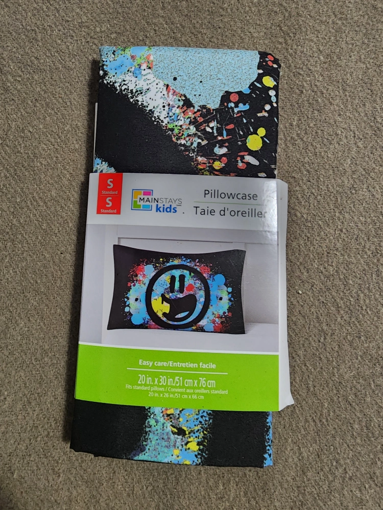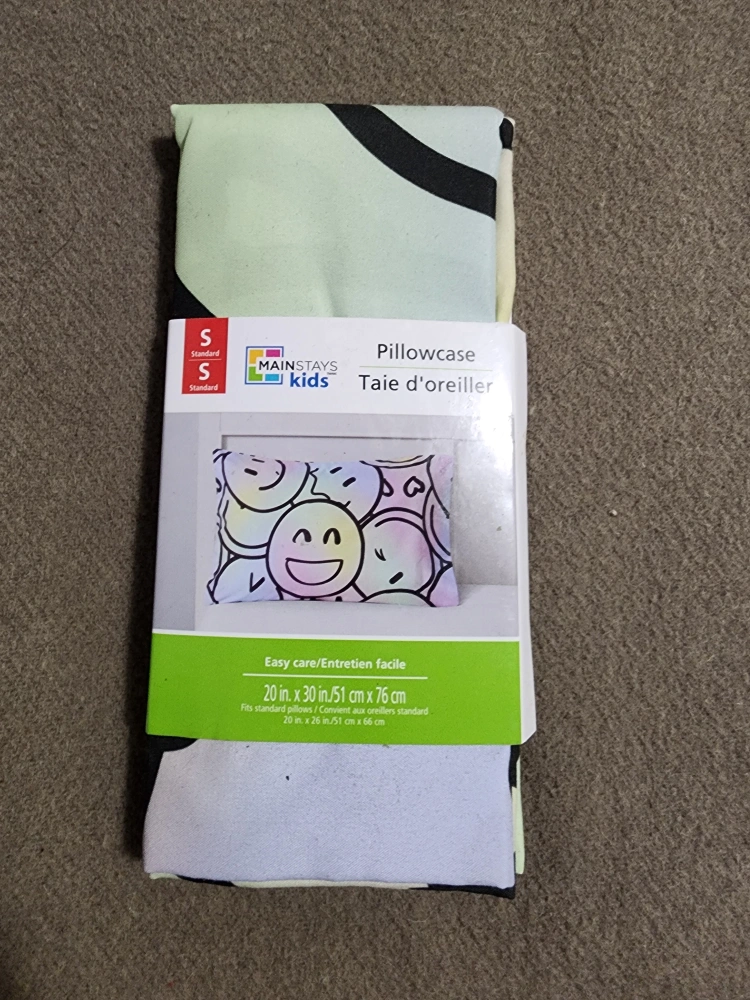 10Here's a Mainstays Kids pillowcase in standard size. It's easy to care for and measures 20 in x 30 in / 51 cm x 76 cm. Fits standard pillows and coordinates with standard 20 in x 26 in / 51 cm x 66 cm pillowcases
