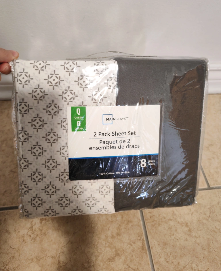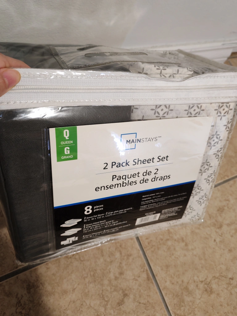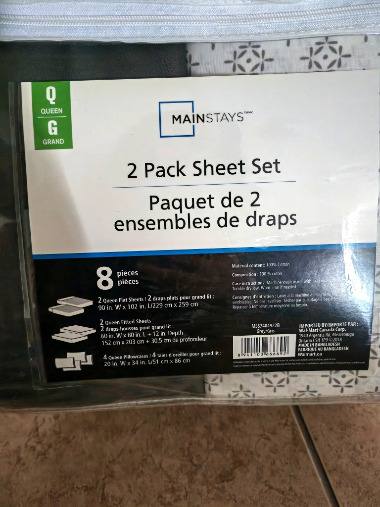 34Selling a brand new Mainstays 2 Pack Sheet Set, size queen. The set includes 8 pieces: 2 queen flat sheets (90 in. W x 102 in. L), 2 queen fitted sheets (60 in. W x 80 in. L x 12 in. Depth), and 4 queen pillowcases (20 in. W x 34 in. L). The material is 100% cotton. The colour is grey/gris Pickup only at Carling Ave/Richmond Road. Close to Britannia Beach and Lincoln Field. Message me if you have any questions.