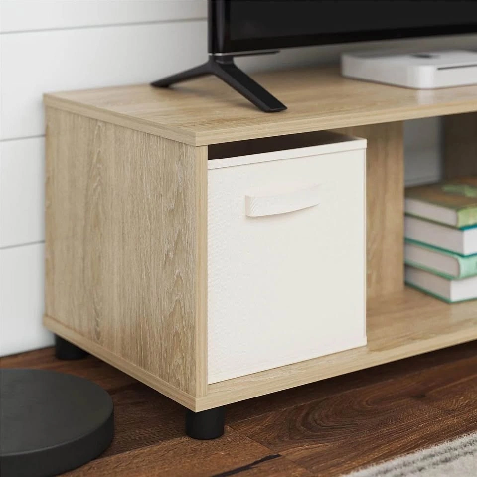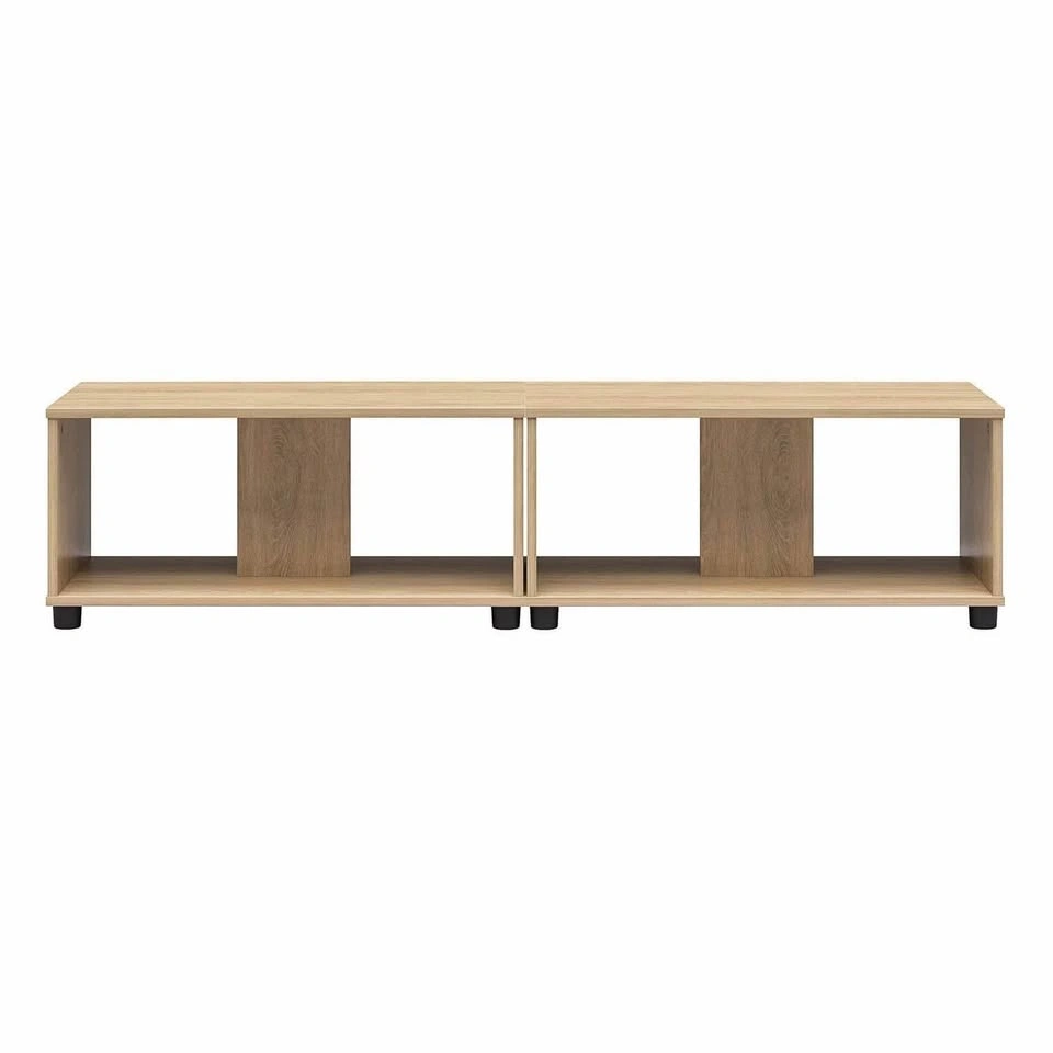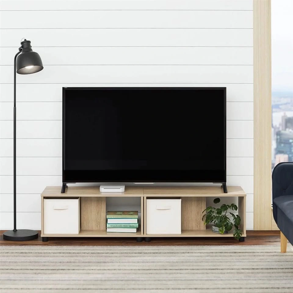 New in box. Enhance your entertainment space with the Mainstays Adjustable Side by Side or Stacking TV Stand, a sleek and versatile solution for modern living rooms. With neutral woodgrain finishes, this minimalistic unit seamlessly fits any contemporary décor. Crafted from durable engineered wood, it accommodates TVs up to 70 inches as the perfect centerpiece. For added flexibility, use it side by side for larger TVs or stack the sections for a stylish setup with open storage for TVs up to 32 inches. Whether it's movie night or a series marathon, this console adapts to your needs. Finished on all sides, it's a functional and modern addition to your living space.