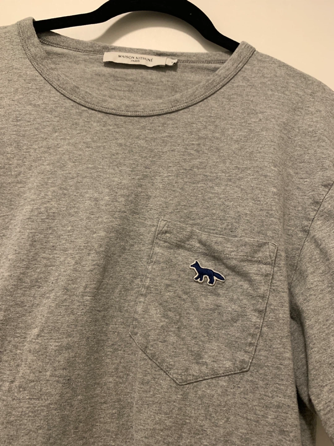 Selling a Maison Kitsuné grey t-shirt in size medium. It features a cute little fox logo on the pocket. Great for a casual look!