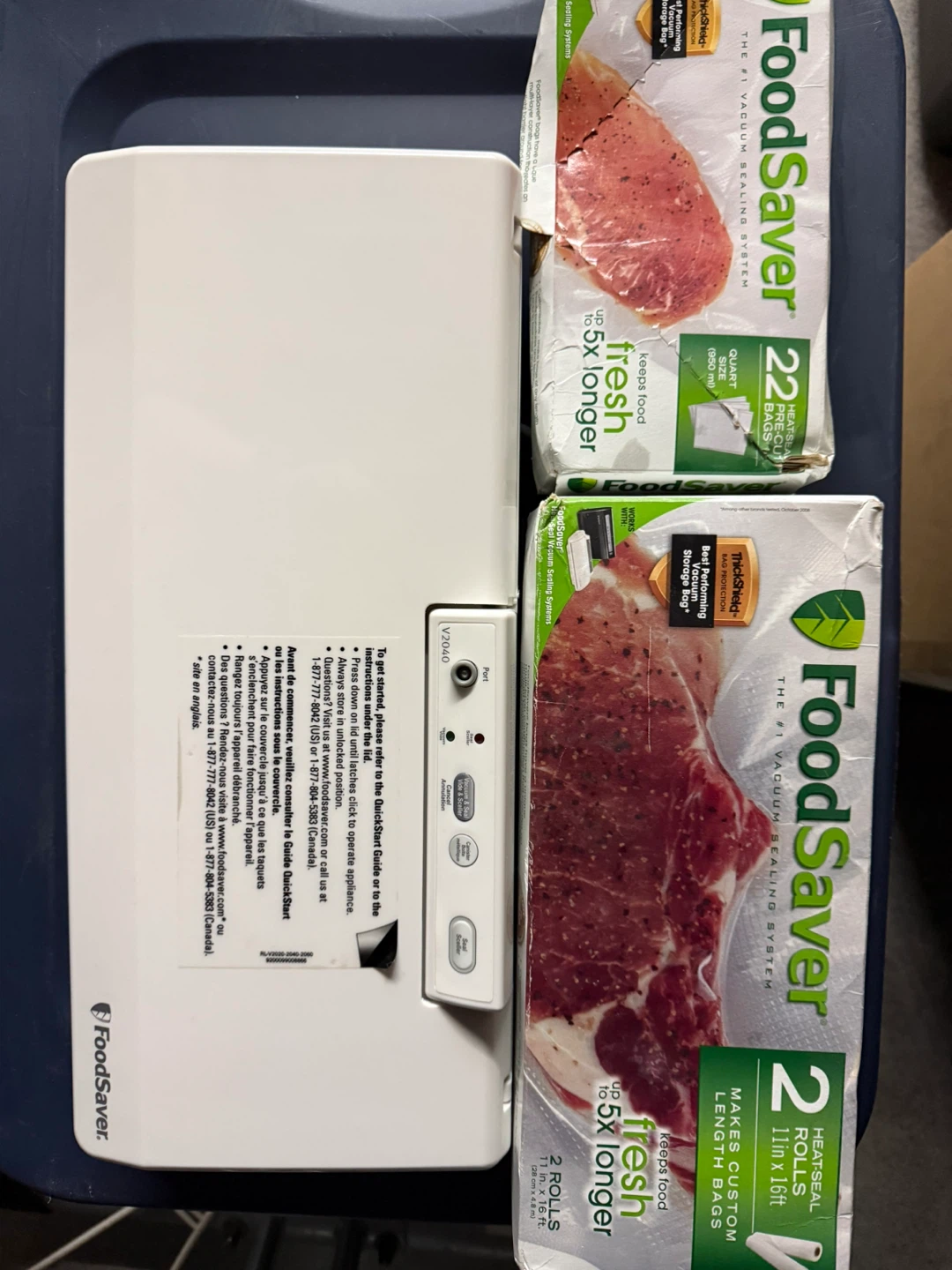 *Like new, only used a handful of times* FoodSaver V2040 vacuum sealing system. Comes with one box of 22 - quart size heat-seal pre-cut bags and one box of 2 heat-seal rolls for custom length bags.