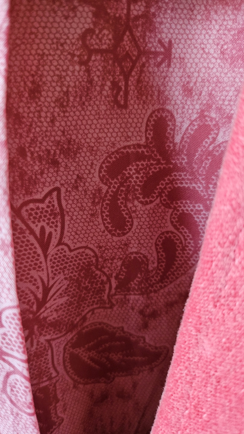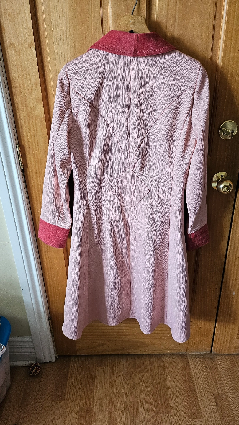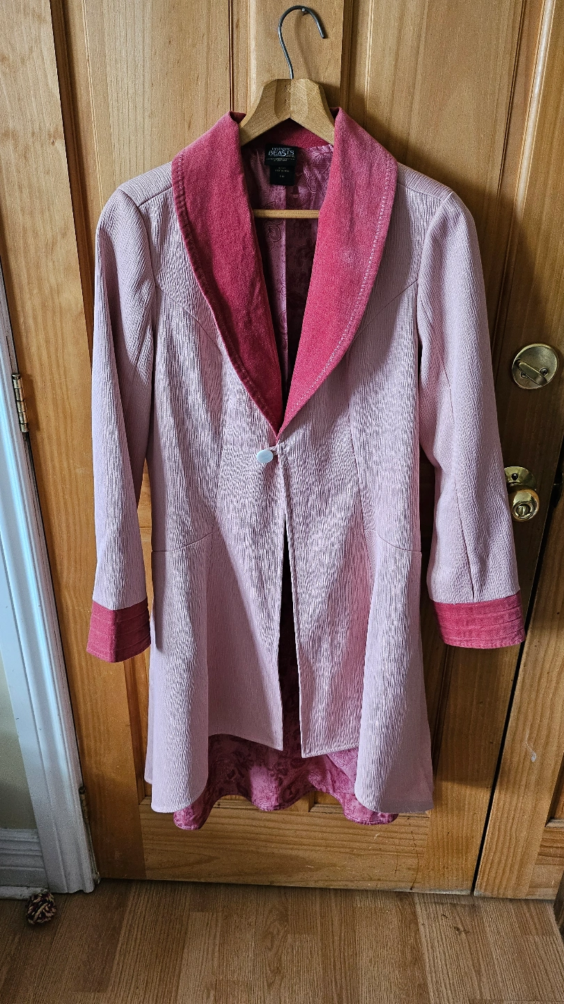 1000+MAKE OFFER! Pink Edwardian style coat with dark pink velvet collar and cuffs. Features a single button closure. Unique floral lining. Size large. Part of a limited edition collection from Hot Topic. Available for pick-up near Oakwood Village.