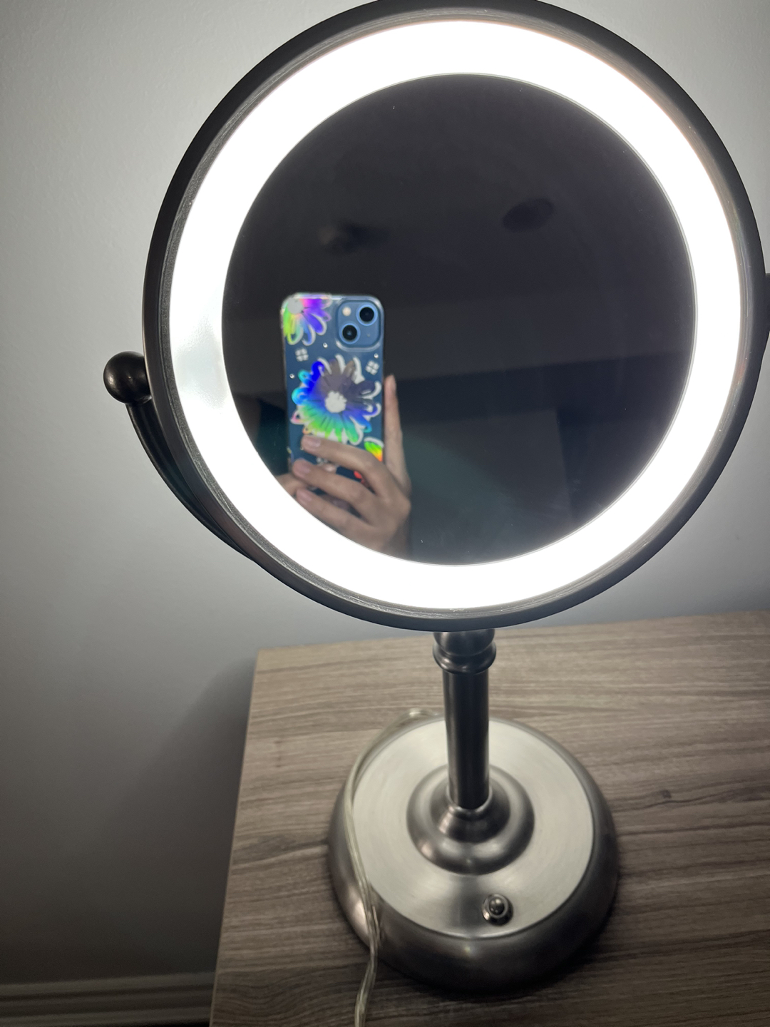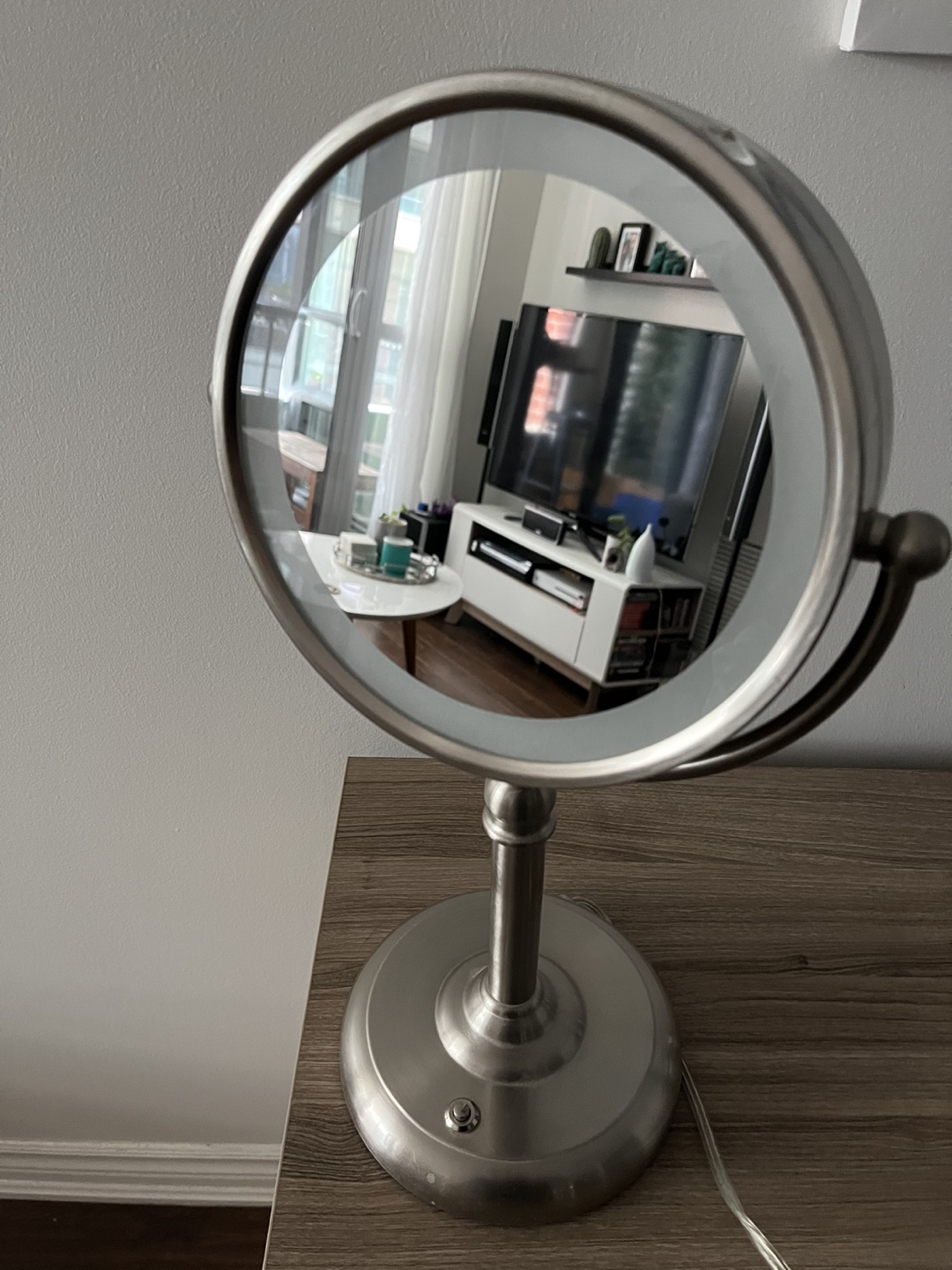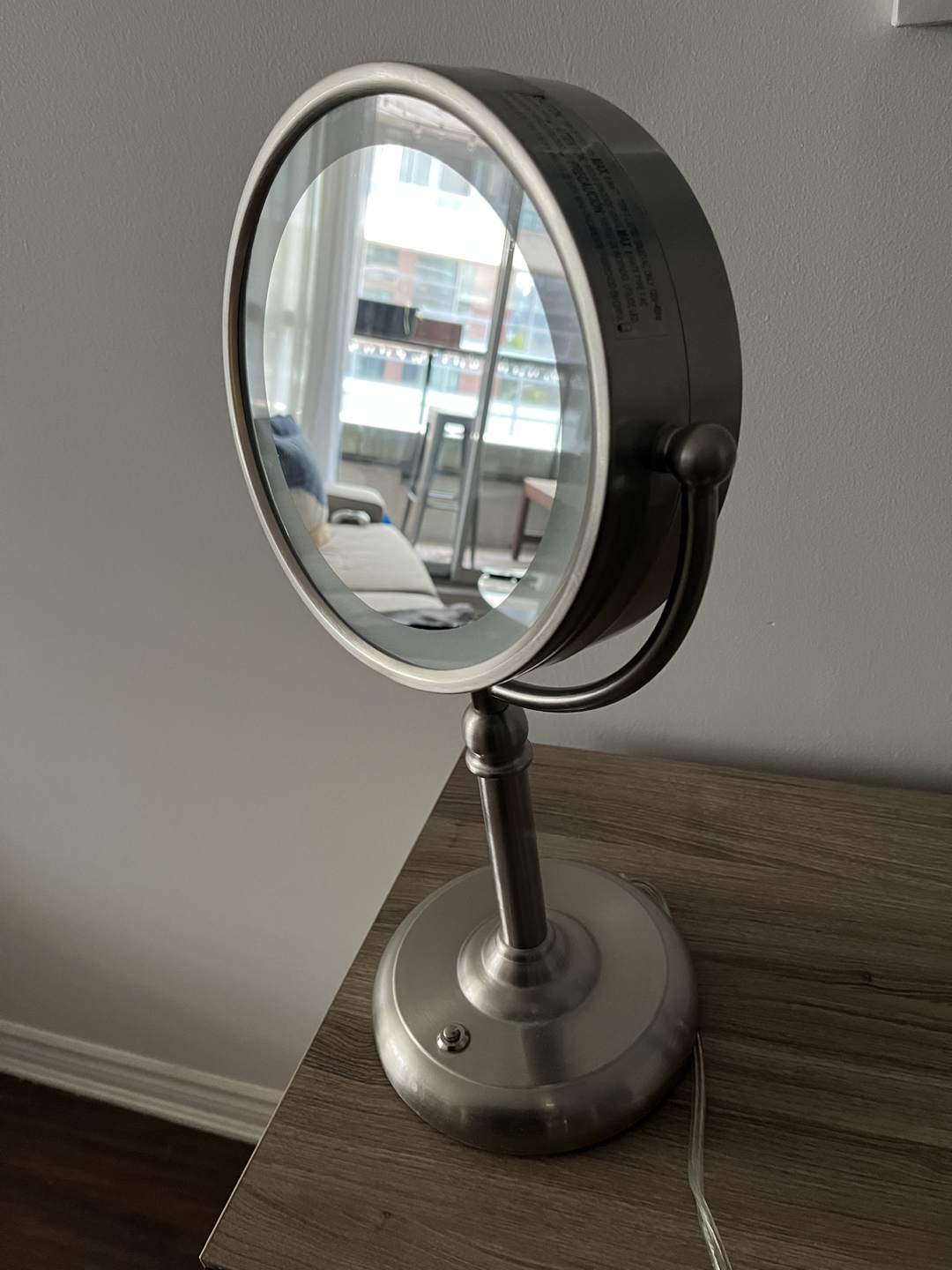 28Make up mirror with LED lights, plug-in. Double sided mirror with magnifying mirror. Dimensions: Diameter - 8” Height - 18” Depth - 2.5”