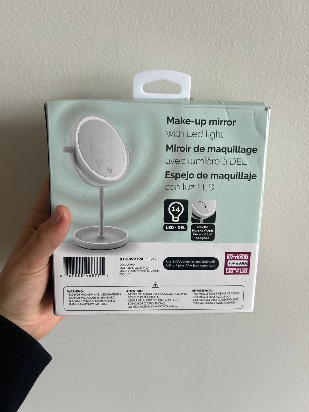 384Selling a make-up mirror with LED light. It's in great condition and comes with the box. Requires 4 AAA batteries (not included) to operate the LED light