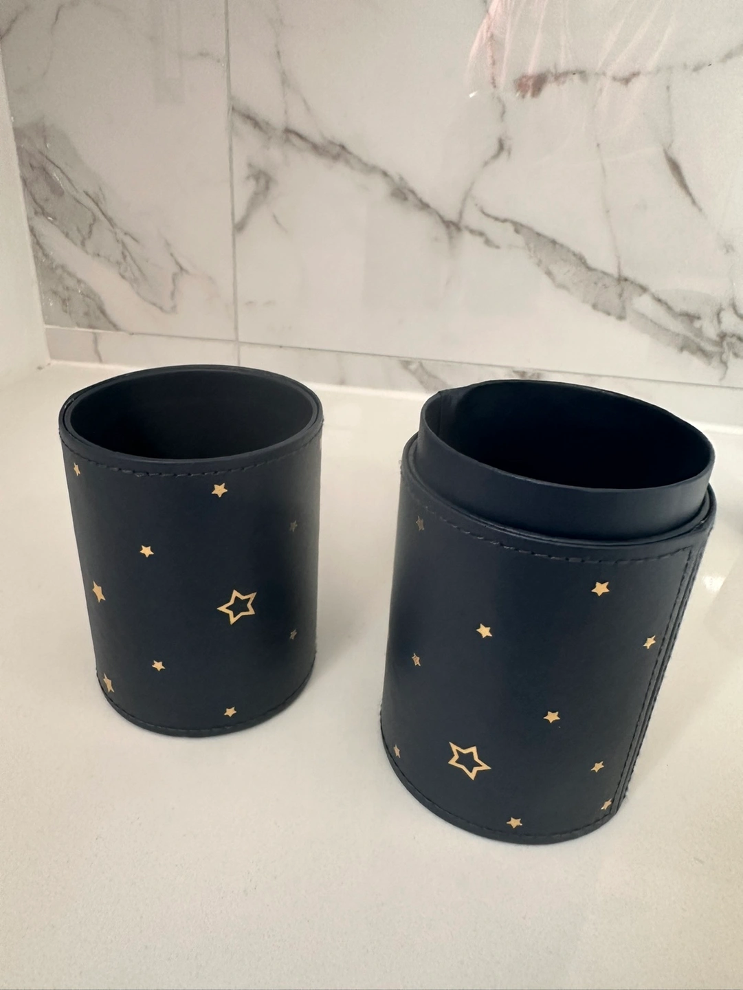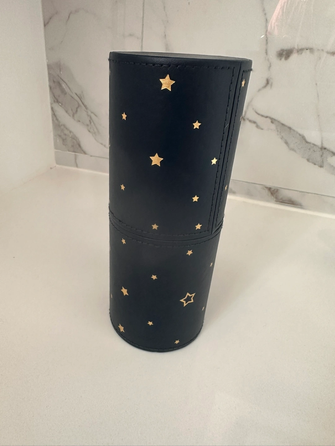 A dark blue makeup brush holder with gold stars. Perfect for travel or to just use at home.