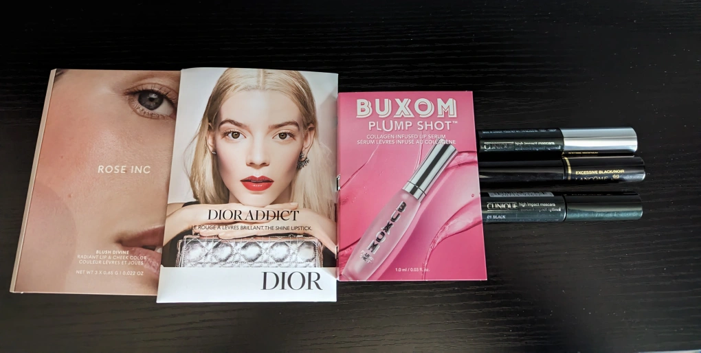 Never used makeup samples and minis. Includes 3 mascaras minis from Clinique and Lancome, a buxom lip plumper mini and lip samples from Dior and Rose inc.