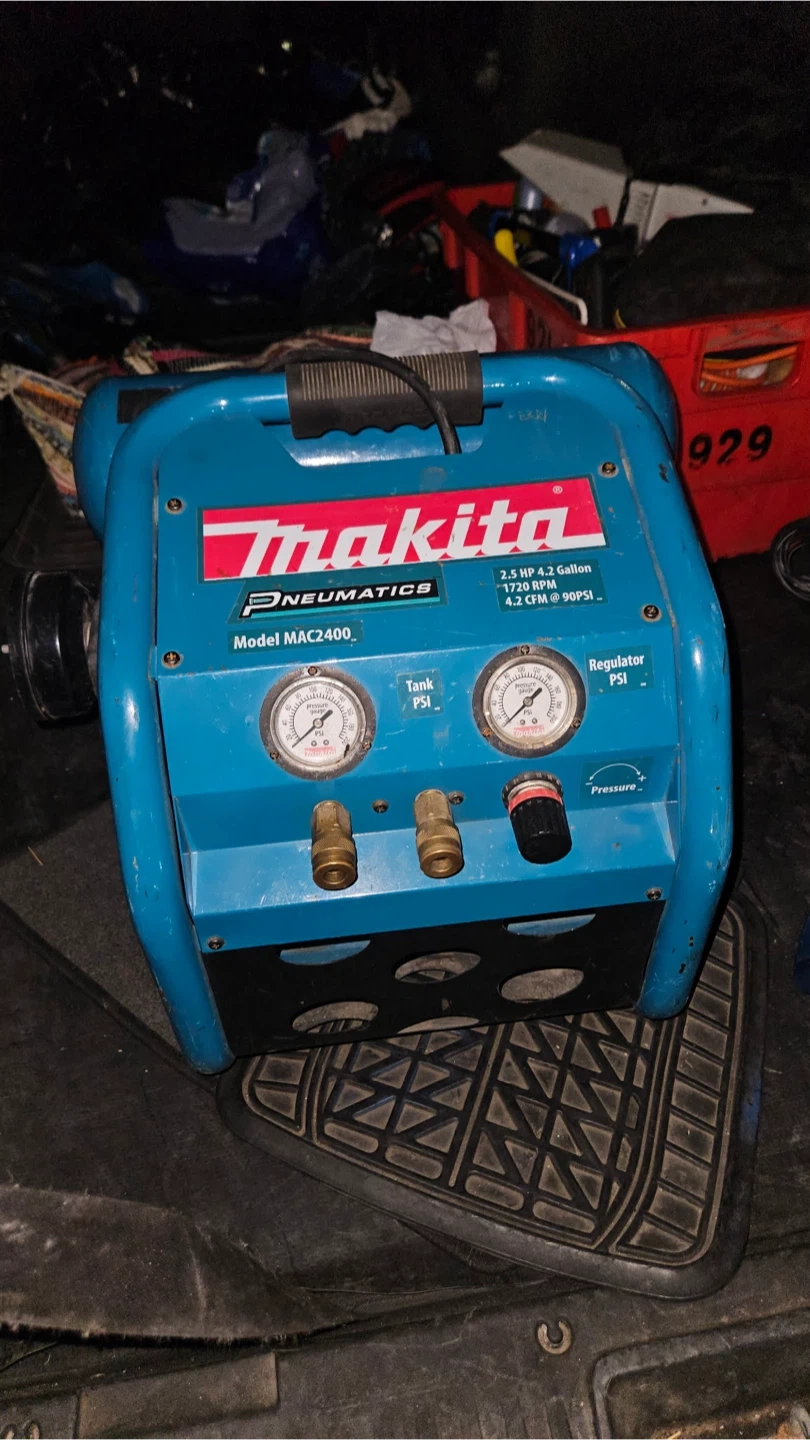 Selling a Makita Pneumatics air compressor, model MAC2400. It's a 2.5 HP unit with a 4.2-gallon tank, running at 1720 RPM and delivering 4.2 CFM at 90 PSI. Great for various tasks!