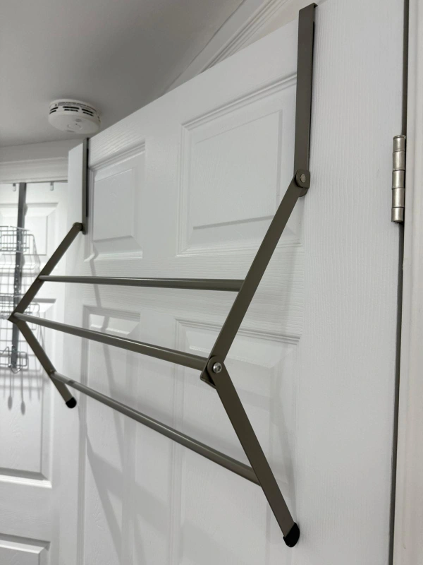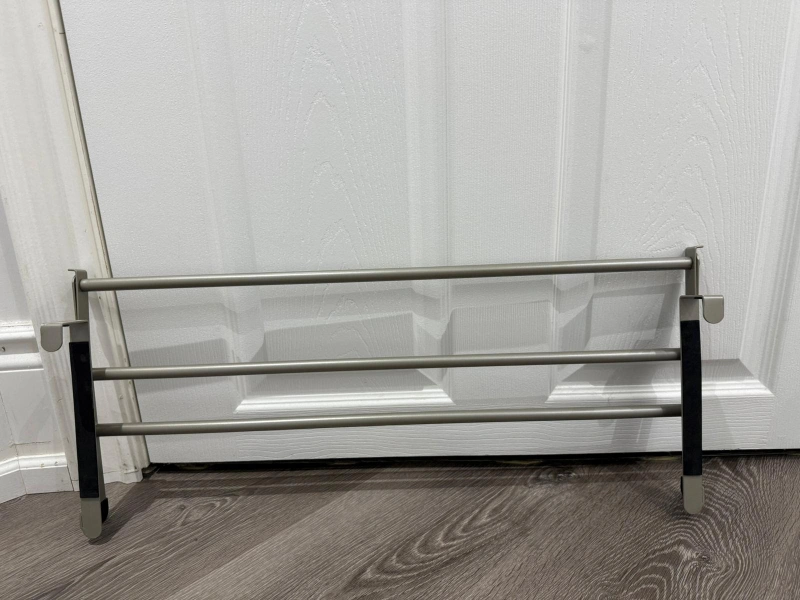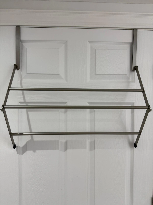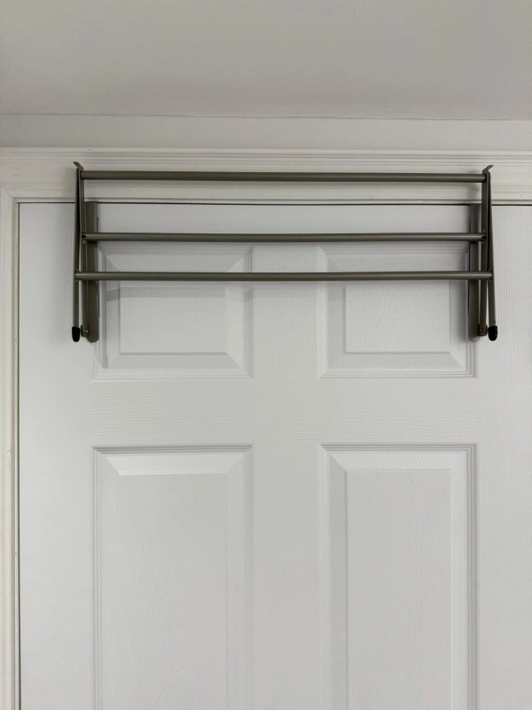 Over the door towel rack, three tiers. Grey colour, with protective pads.