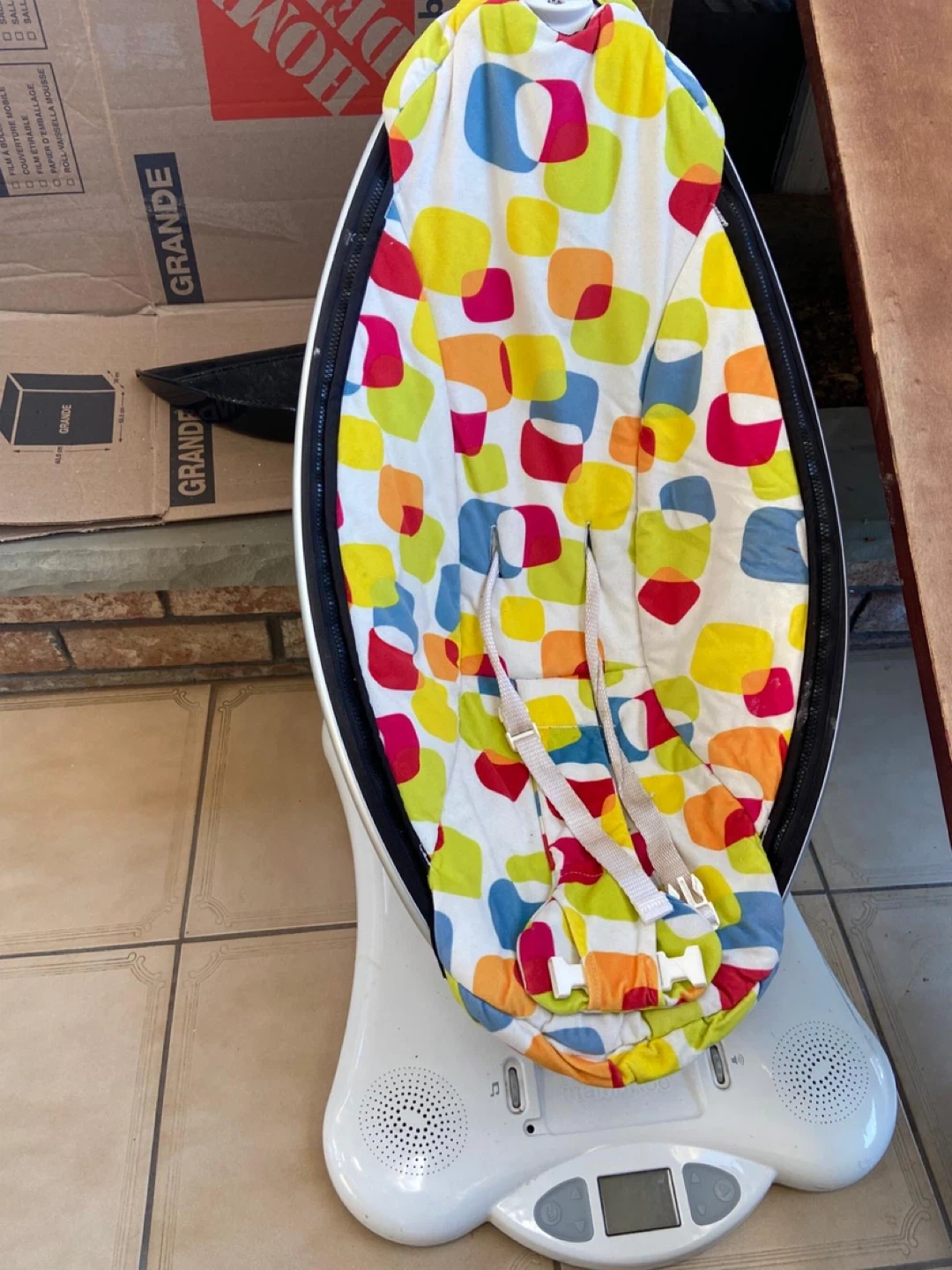 10Selling a MamaRoo baby swing. It's in great condition and ready for a new little one! The seat has a colourful pattern with yellow, red, and blue squares. It will keep your baby happy and entertained