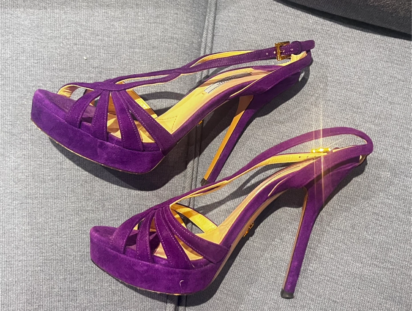 Prada heels are made from vibrant purple suede and feature a stylish platform. They have a delicate ankle strap with a buckle closure. The interior lining is a bright yellow.