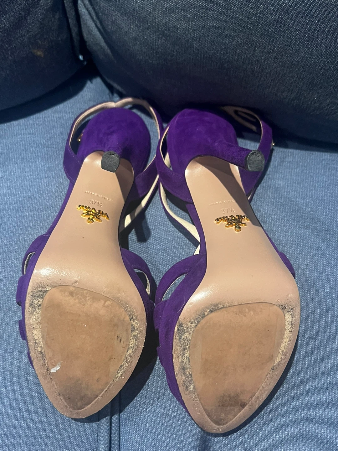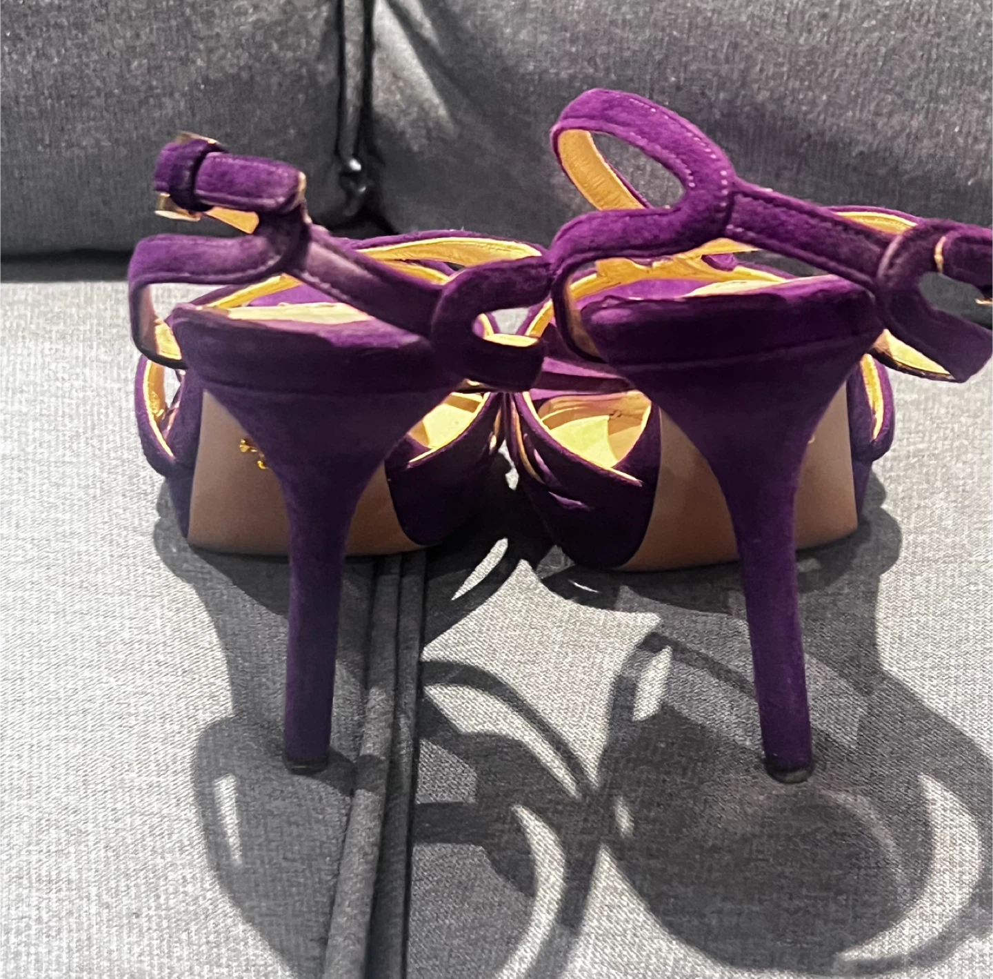Prada heels are made from vibrant purple suede and feature a stylish platform. They have a delicate ankle strap with a buckle closure. The interior lining is a bright yellow.