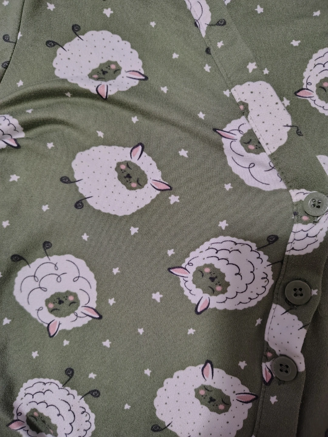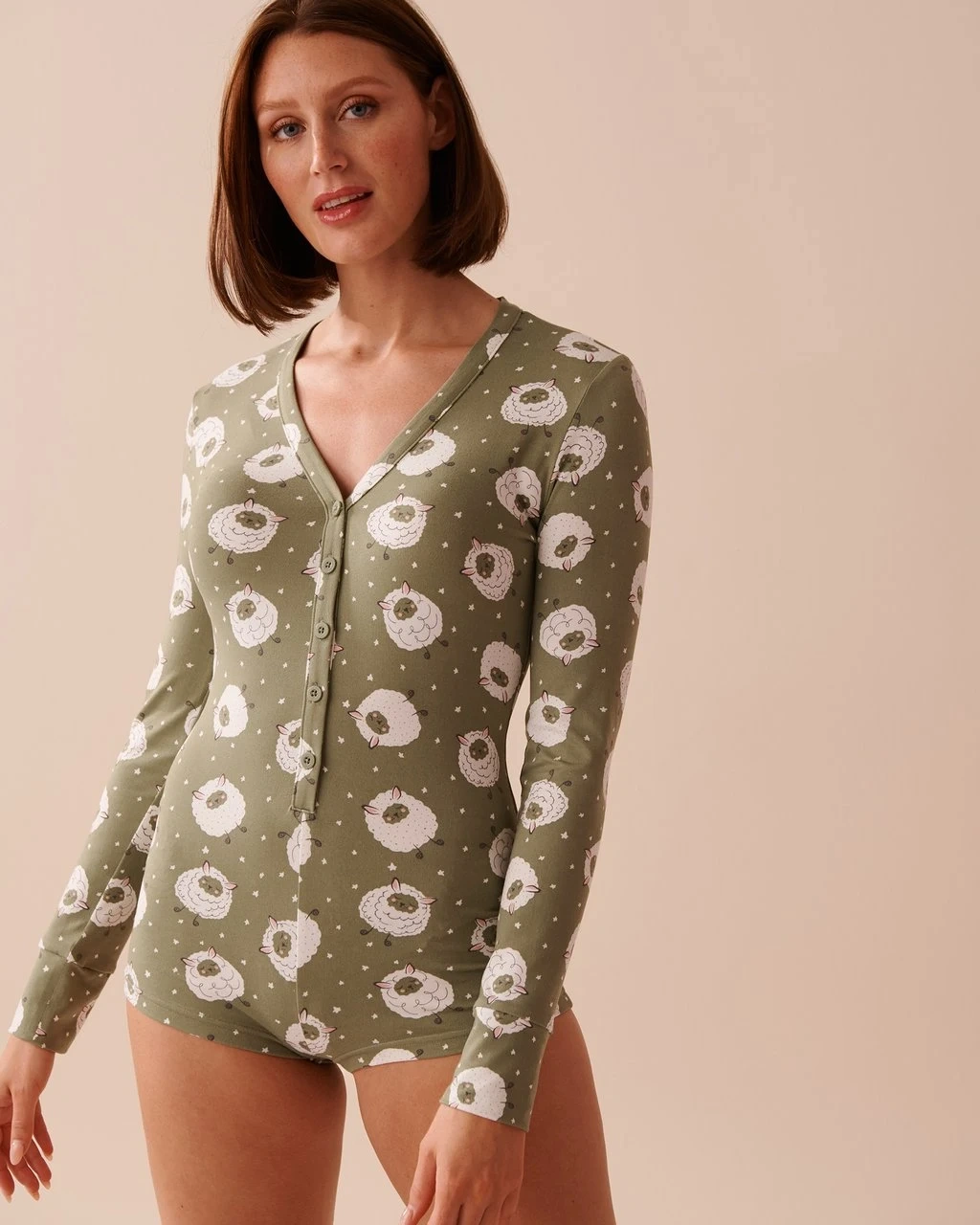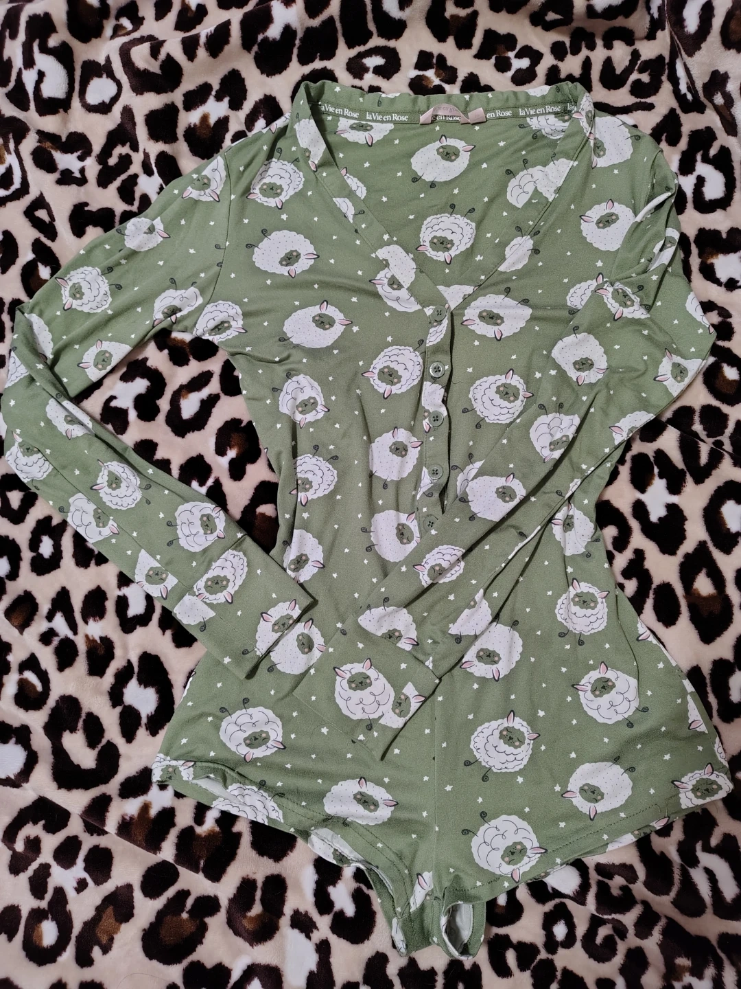 This la Vie en Rose long-sleeved romper features a cute all-over sheep print. It's a size S made with very soft buttery fabric. The v-neck design has a button-up front. And is overall cute for lounging too!