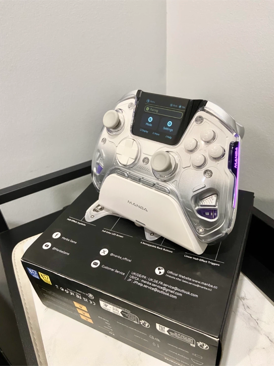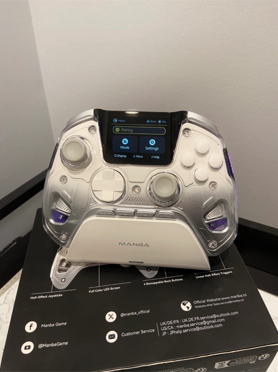 Selling a MANBA game controller! It features Hall-Effect joysticks, a full-color LED screen, and 4 remappable back buttons. It also has linear Hall-Effect triggers. Have not been used, comes with the original box! Retails $95