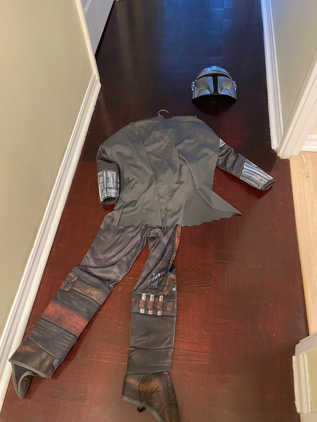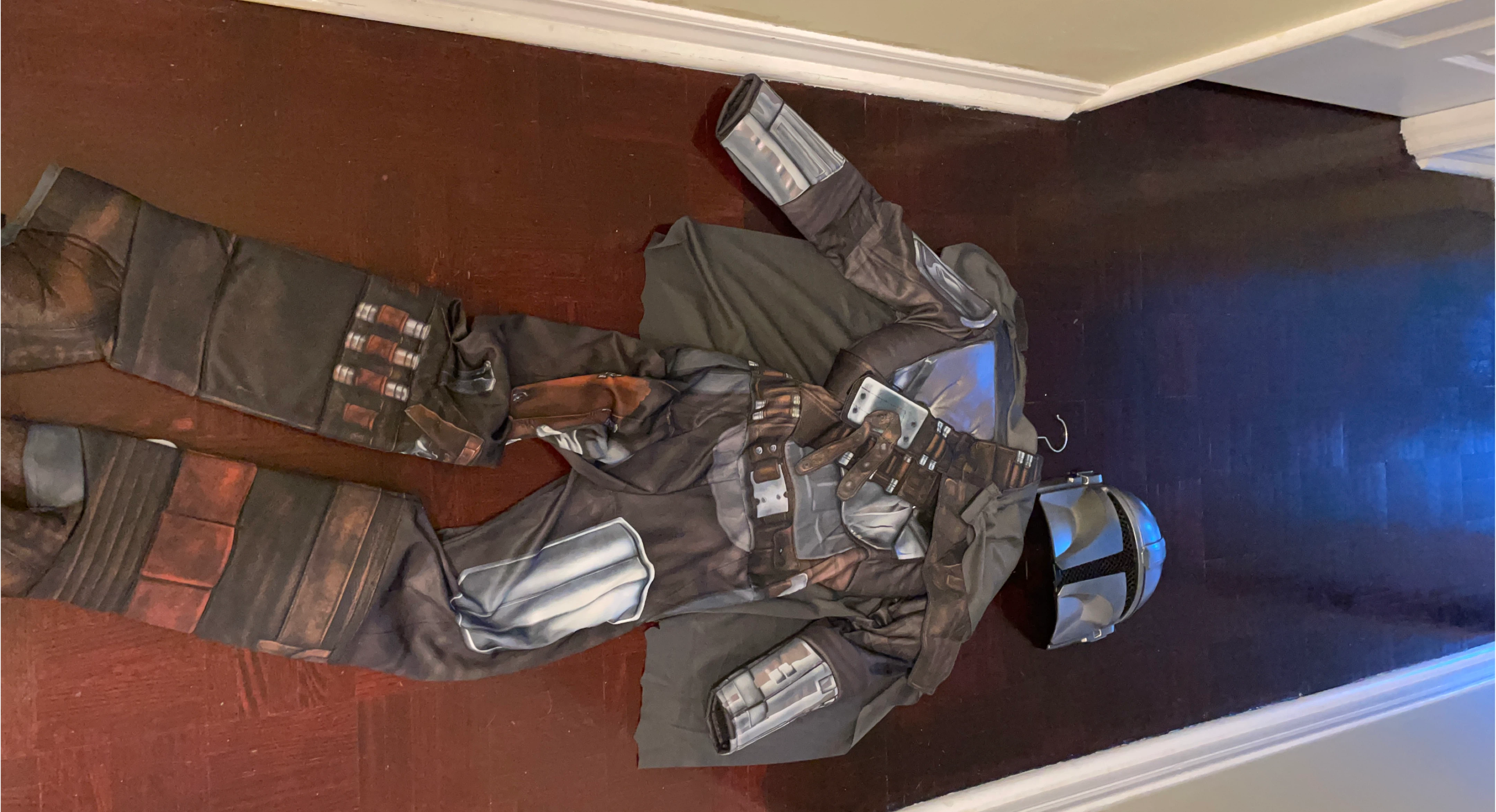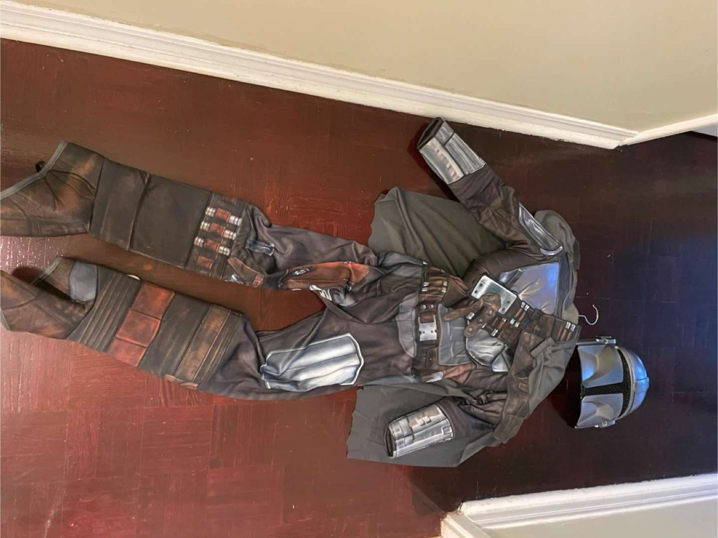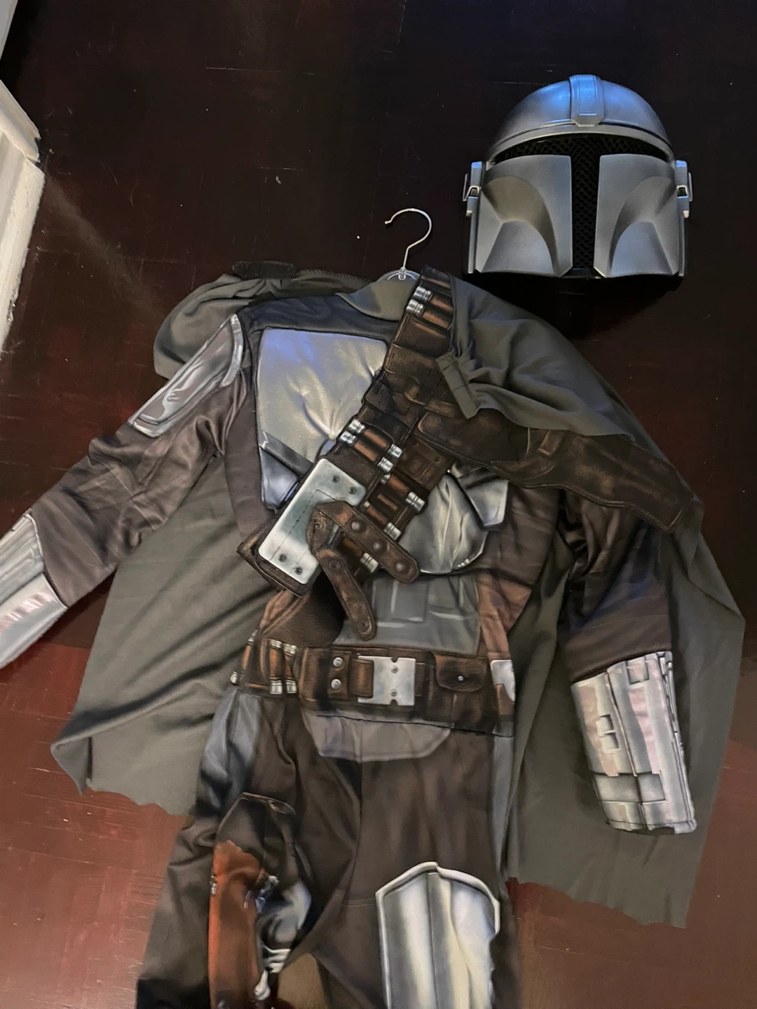 Selling a Mandalorian costume. It includes the helmet, cape, and jumpsuit. Great for dress-up or Halloween!Boys size M