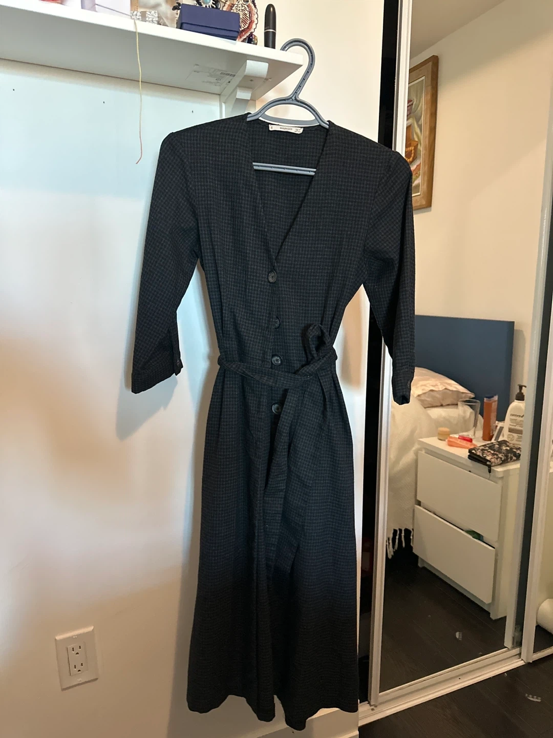 10Selling a cute Mango dress! It's a midi length with a houndstooth pattern. It has a flattering v-neck and a tie waist. Perfect for work or a casual outing!