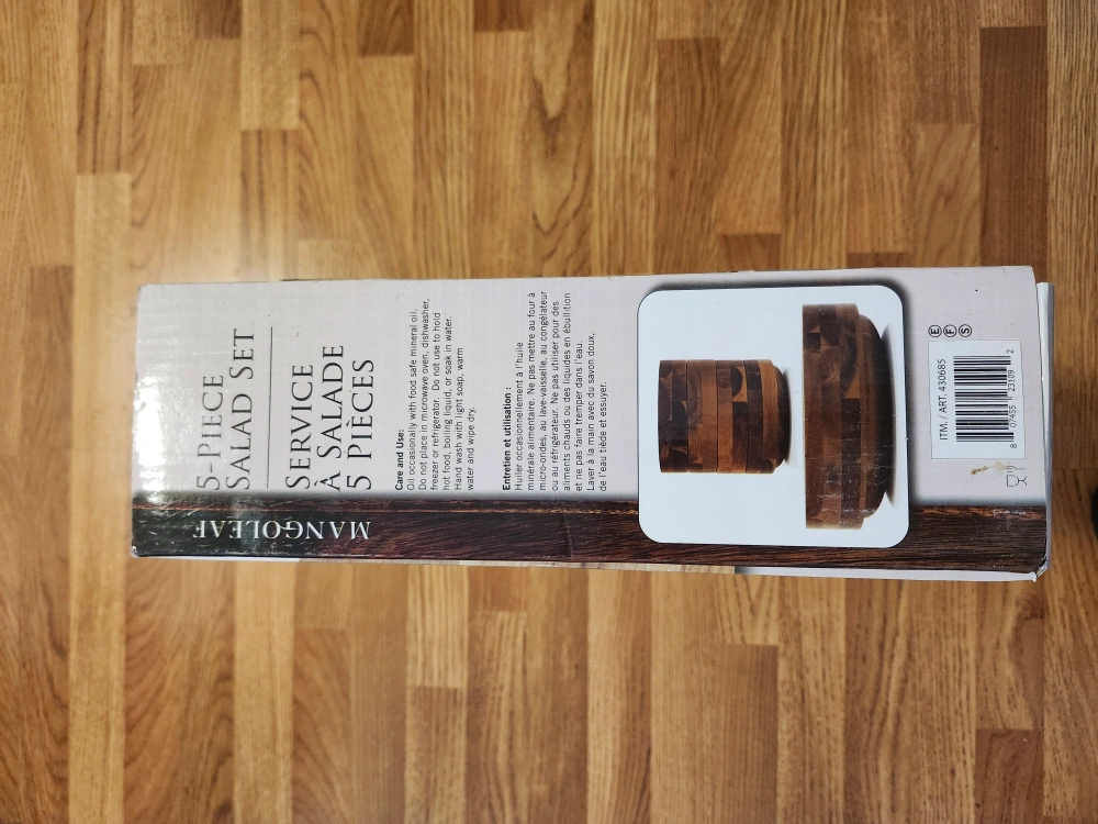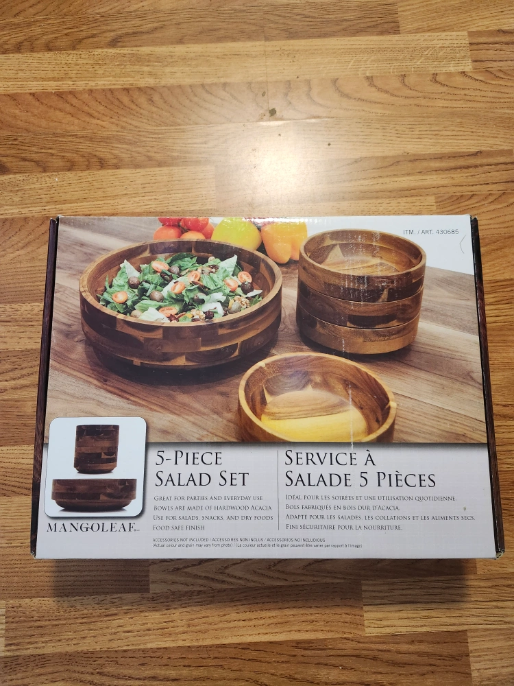 0Selling a brand new Mangoleaf 5-piece salad set! It's still in its original packaging. This set is great for everyday use and parties. The bowls are made of hardwood acacia, perfect for salads, snacks, and dry foods. Ideal for serving salads, snacks, and other delicious treats!
