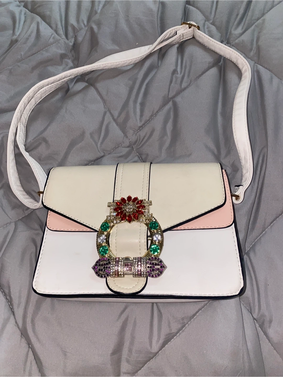 This stylish purse features a tri-colour design in white, pink, and black with a decorative, jewelled buckle closure. It has an adjustable crossbody strap and multiple interior compartments, including zippered pockets, for organization. The exterior is made of a smooth material.