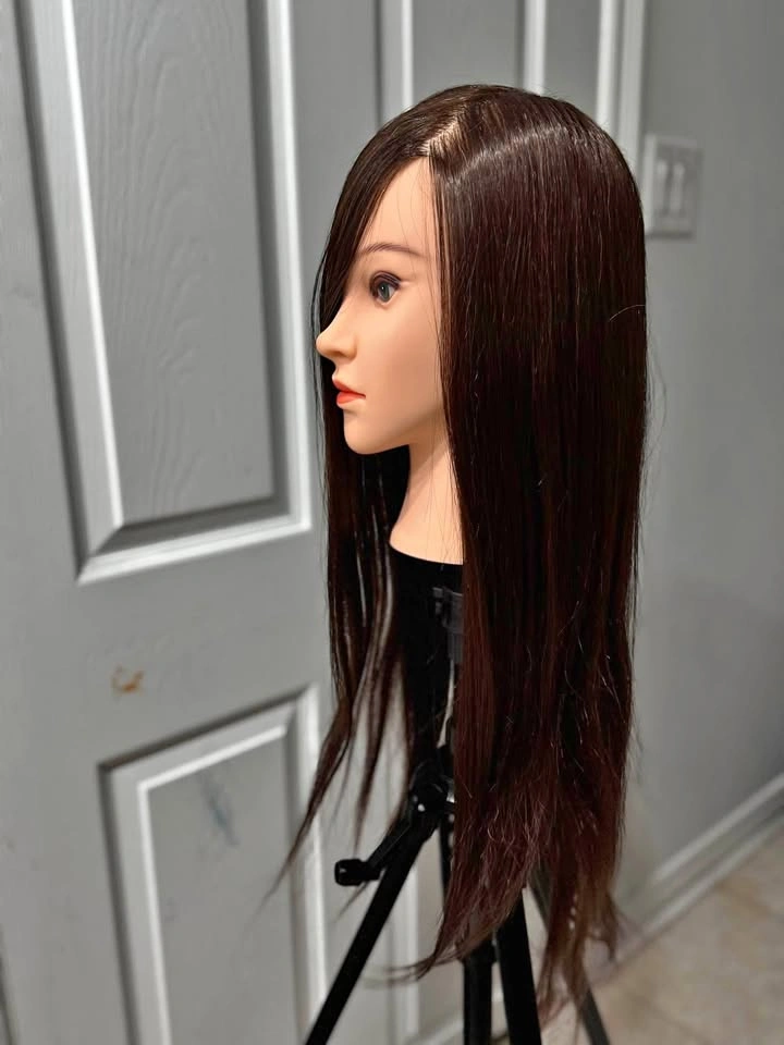 Perfect for hairstylists, students, and beauty enthusiasts! ✨ Details: • 80% high-quality human hair – soft, realistic & easy to style • Length: 28” • Color: #4 Dark Brown • Ideal for cutting, braiding, curling, straightening & updos • Comes with a free clamp holder for easy setup