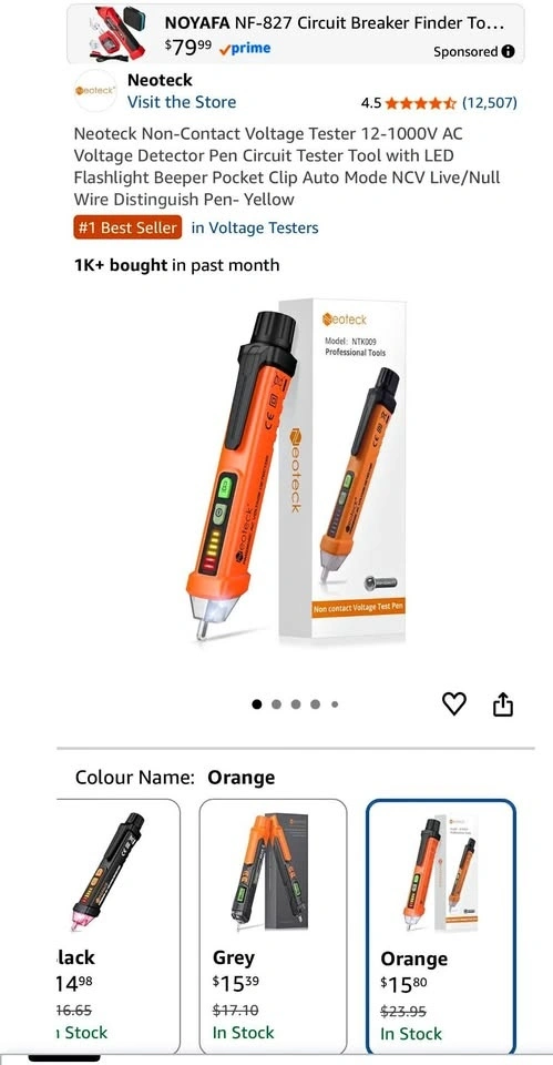 New Neoteck Non-Contact Voltage Tester 12-1000V AC Voltage Detector Pen Circuit Tester Tool with LED Flashlight, Beeper, and Pocket Clip. It has Auto Mode and can distinguish between Live and Null wires. Retails for $15.80 on sale on Amazon. Asking $8. X-posted. Pick up near Coxwell and Danforth.
