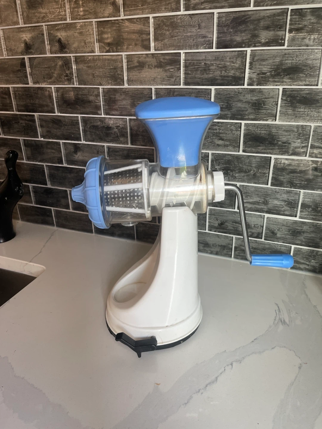 Selling a manual juicer in great condition! It's white with blue accents. Perfect for making fresh juice at home