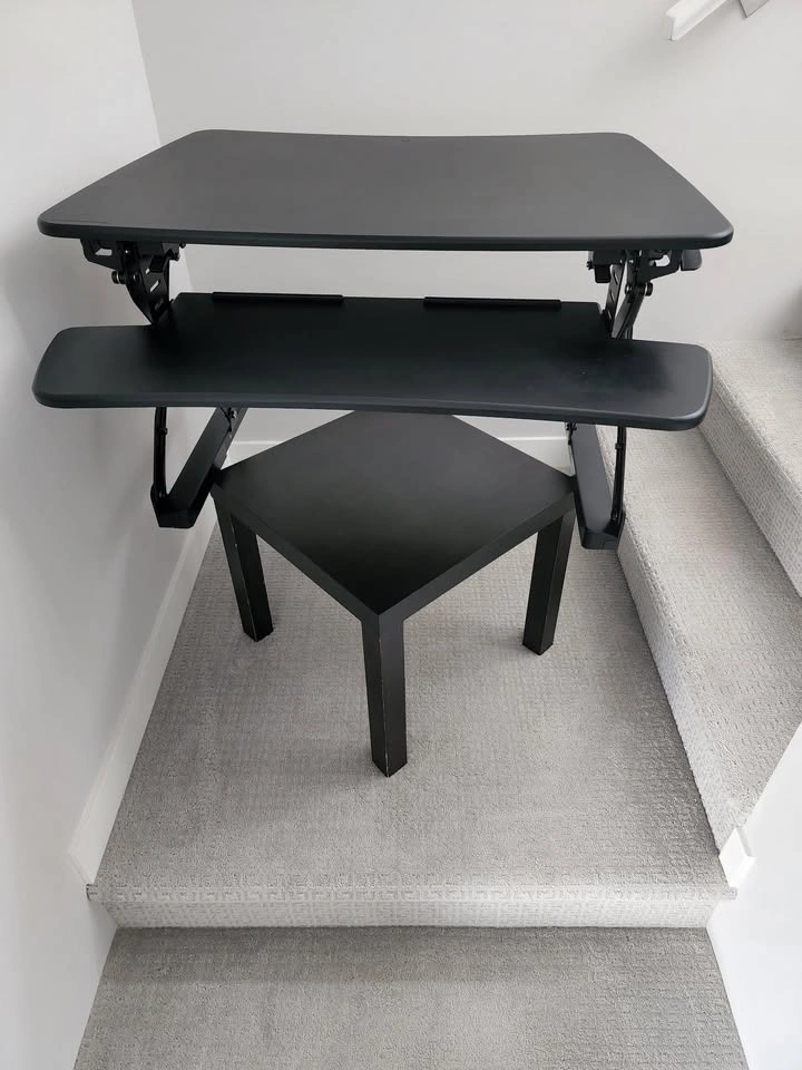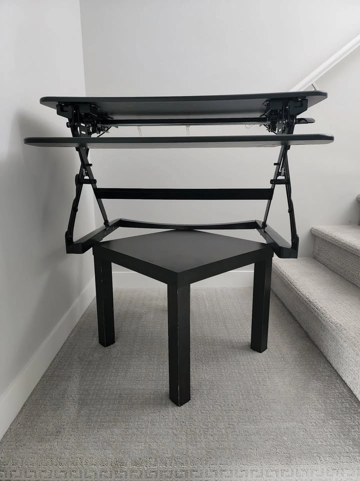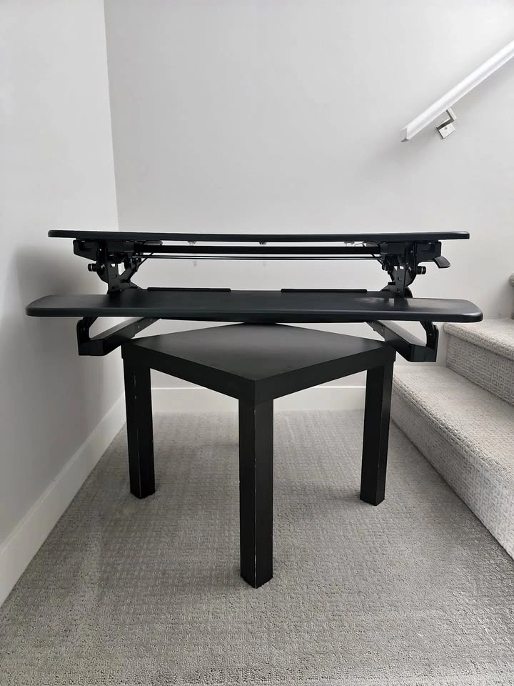 60This is a simple all black in great condition manual standing desk that can be placed on any table/desk surface.