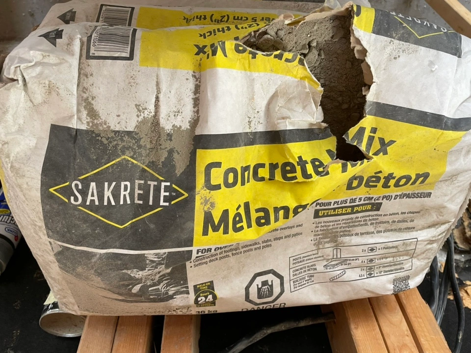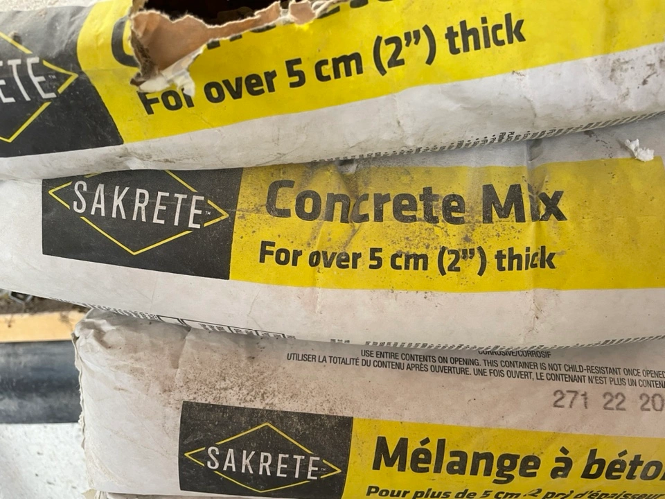A stack of 7 bags of Sakrete Concrete Mix for over 5 cm (2") thick.