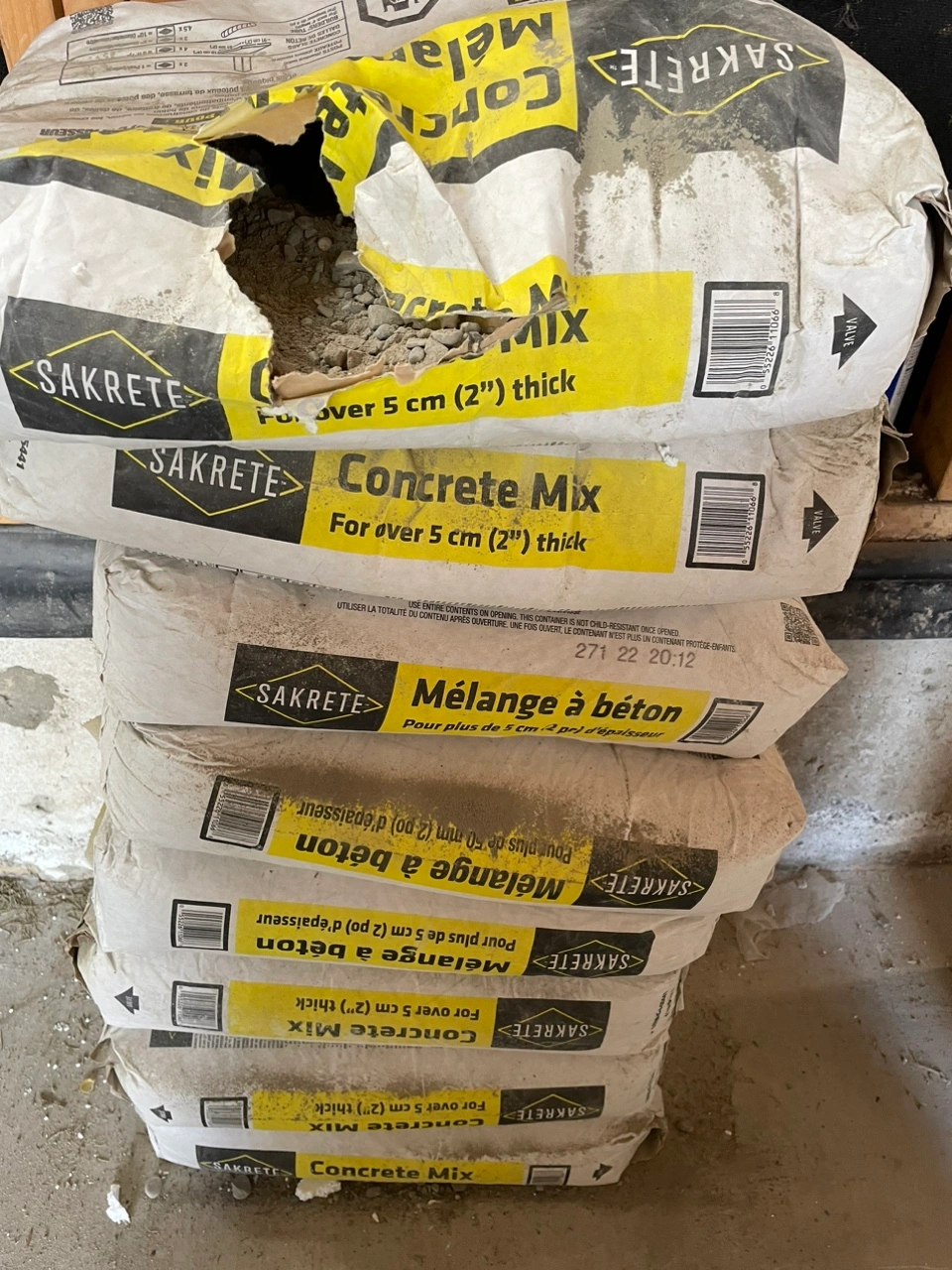 A stack of 7 bags of Sakrete Concrete Mix for over 5 cm (2") thick.