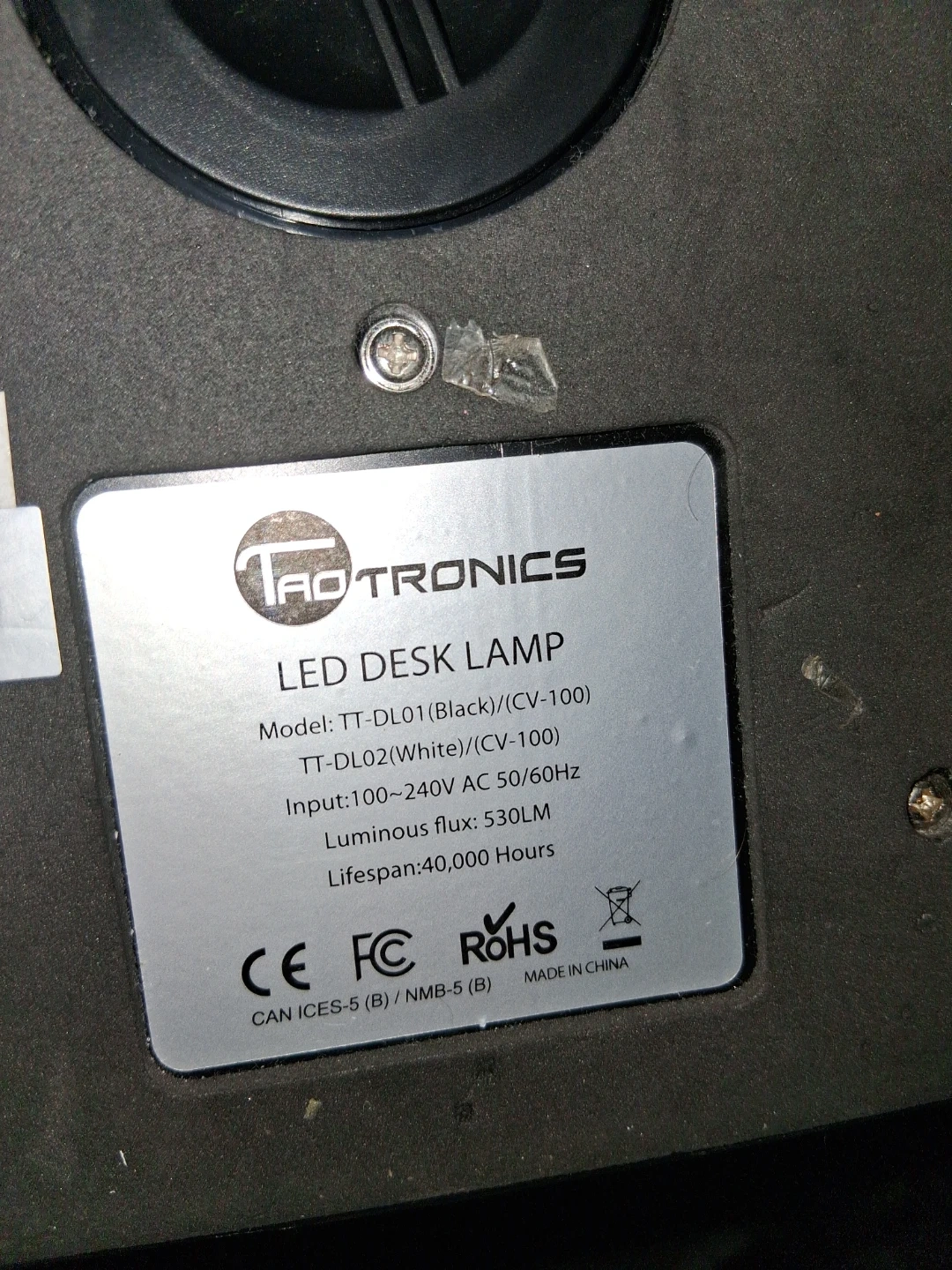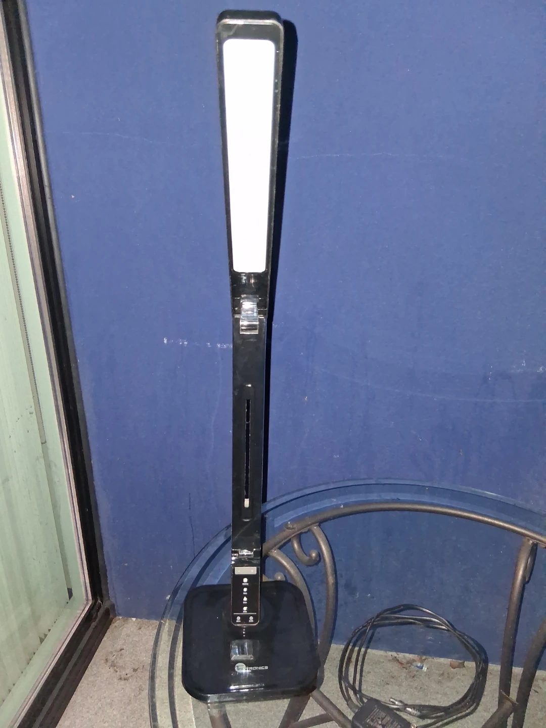 This is a TaoTronics LED desk lamp. It features four lighting modes: Reading, Study, Relax, and Sleep. It also includes a 60-minute timer and On/Off button. The lamp comes with its AC adapter. Also you can charge your electronics via USB cable with it. Very good quality and ready for a new home.