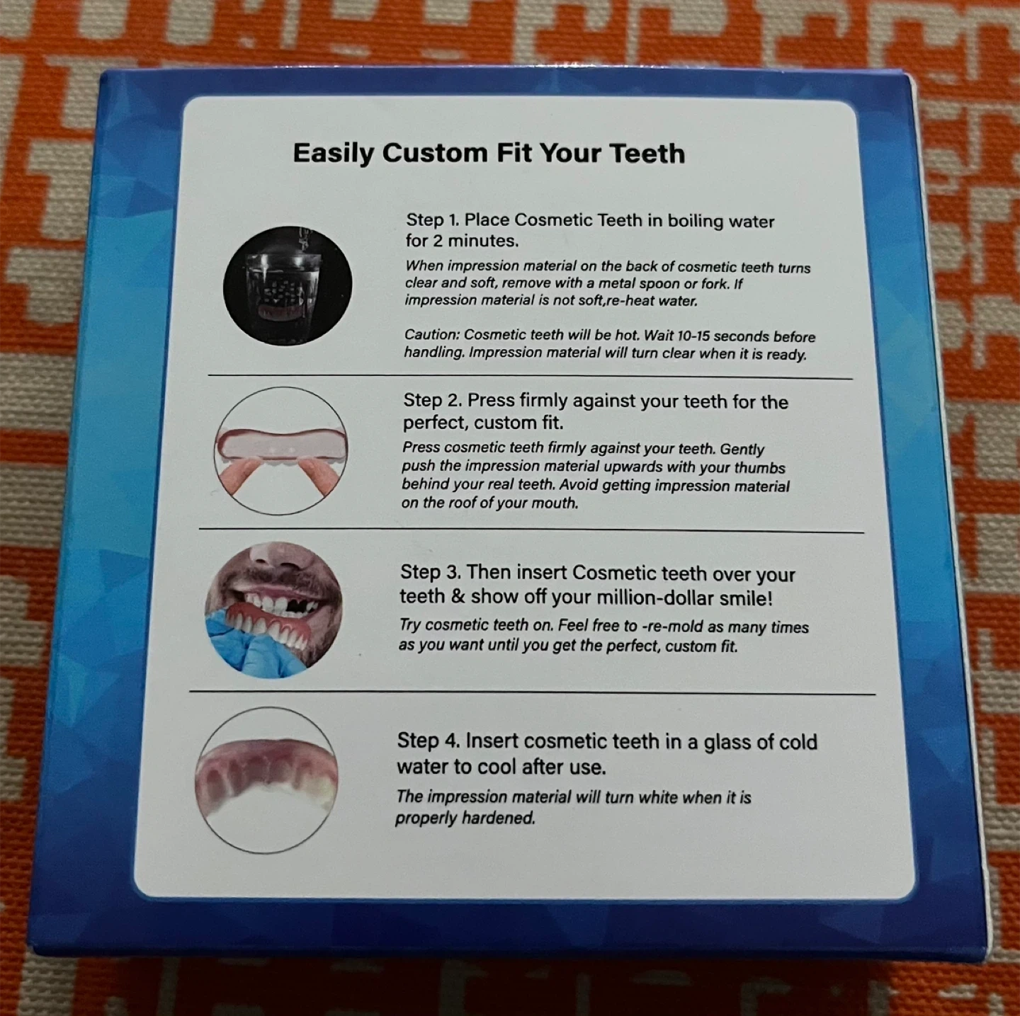 This is a new Instant Teeth Replacement kit for custom fitting. It includes cosmetic teeth, a case, and impression material. The kit is designed for a one-size-fits-all custom fit.