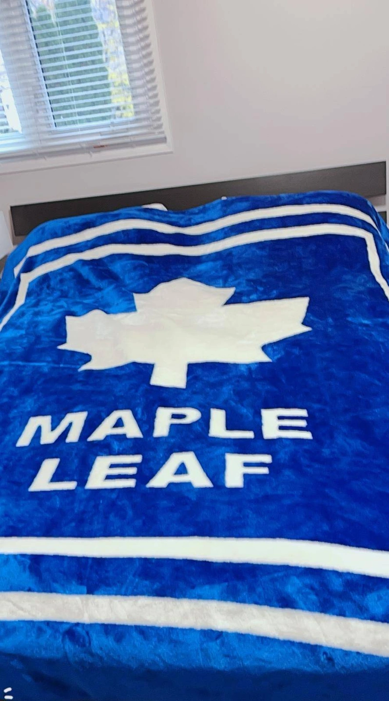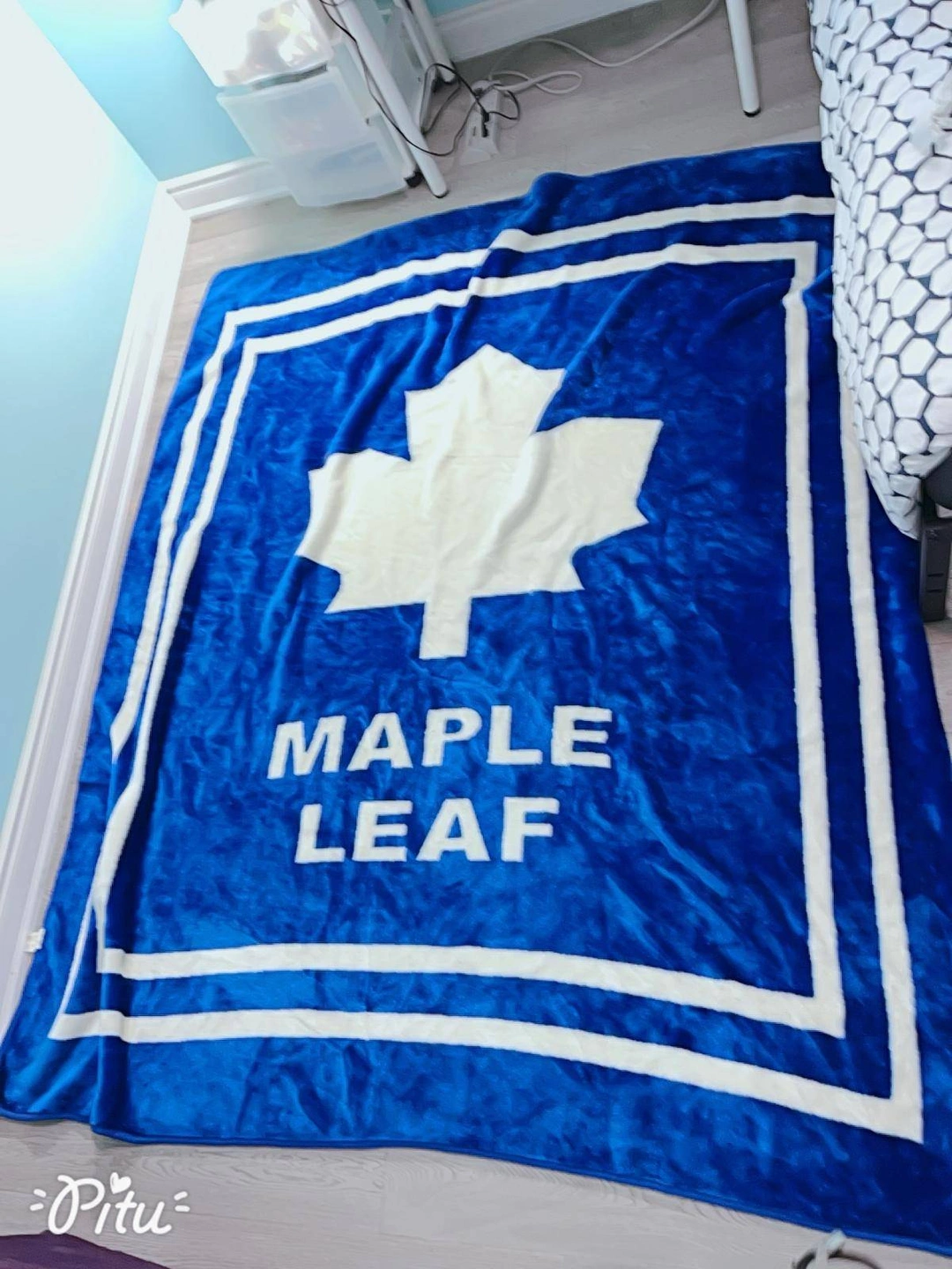 54Maple leaf blanket with a white maple leaf design and "MAPLE LEAF" text, perfect for keeping warm and showing Canadian pride. Made in Korea. 3.5 kg