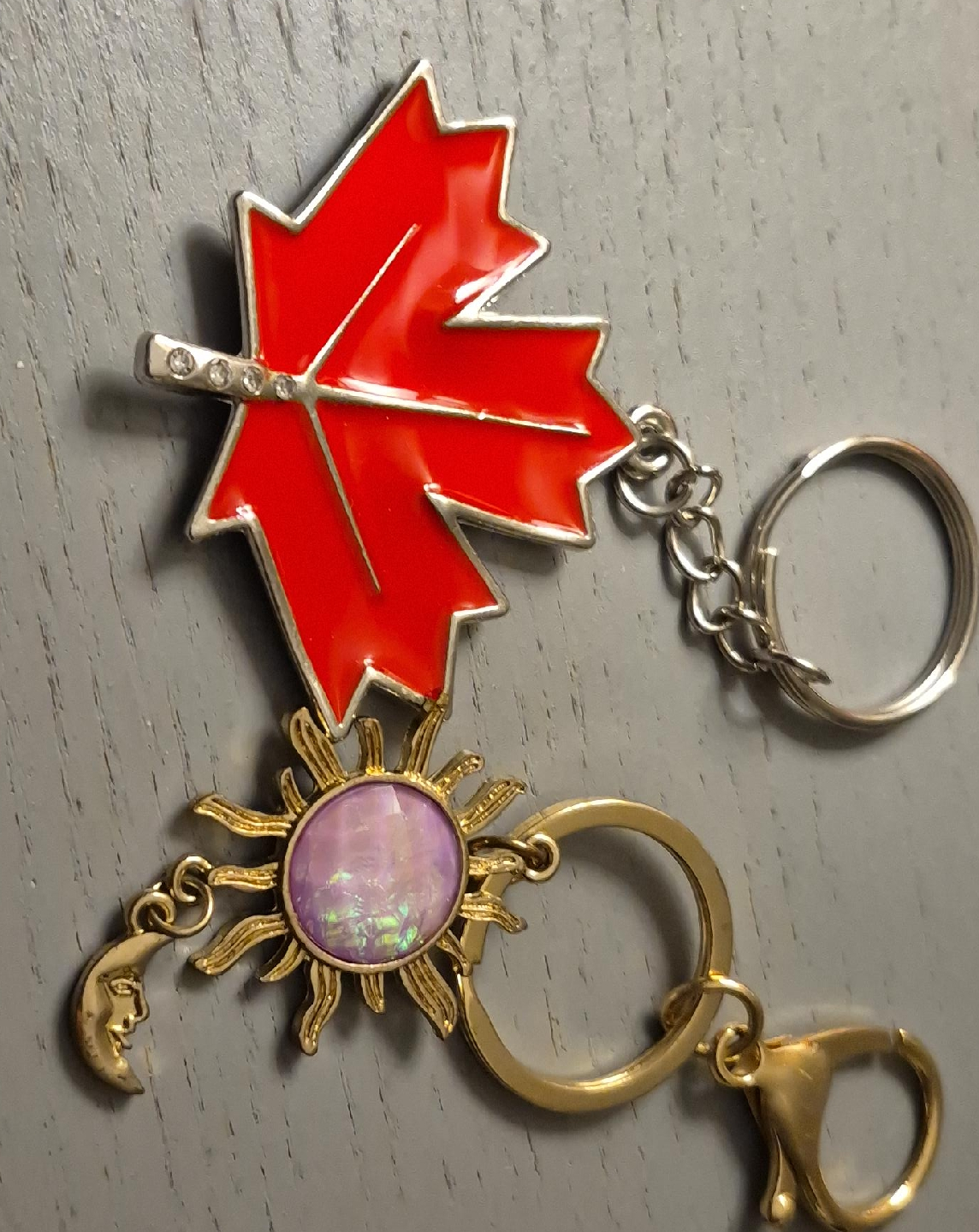 25Selling two unique keychains! One is a bright red maple leaf, perfect for showing off some Canadian pride. The other is a gold-tone sun with a moon charm. Both are in great condition and ready to add some flair to your keys