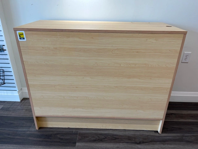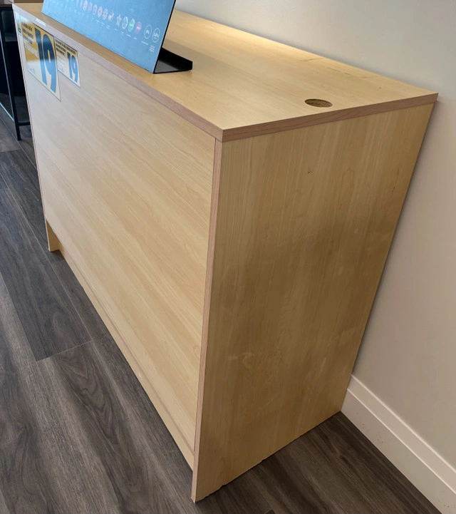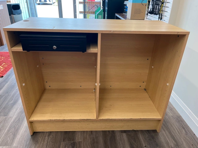91Spruce up your retail space with this functional Maple wood counter! It features a cash drawer, and some open storage. It's perfect for any small business. * Dimensions: 48" x 24" x 36" * Material: Maple Wood * Colour: Light Wood If the ad is up, it's available!
