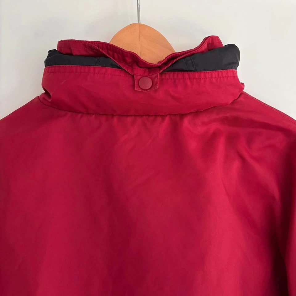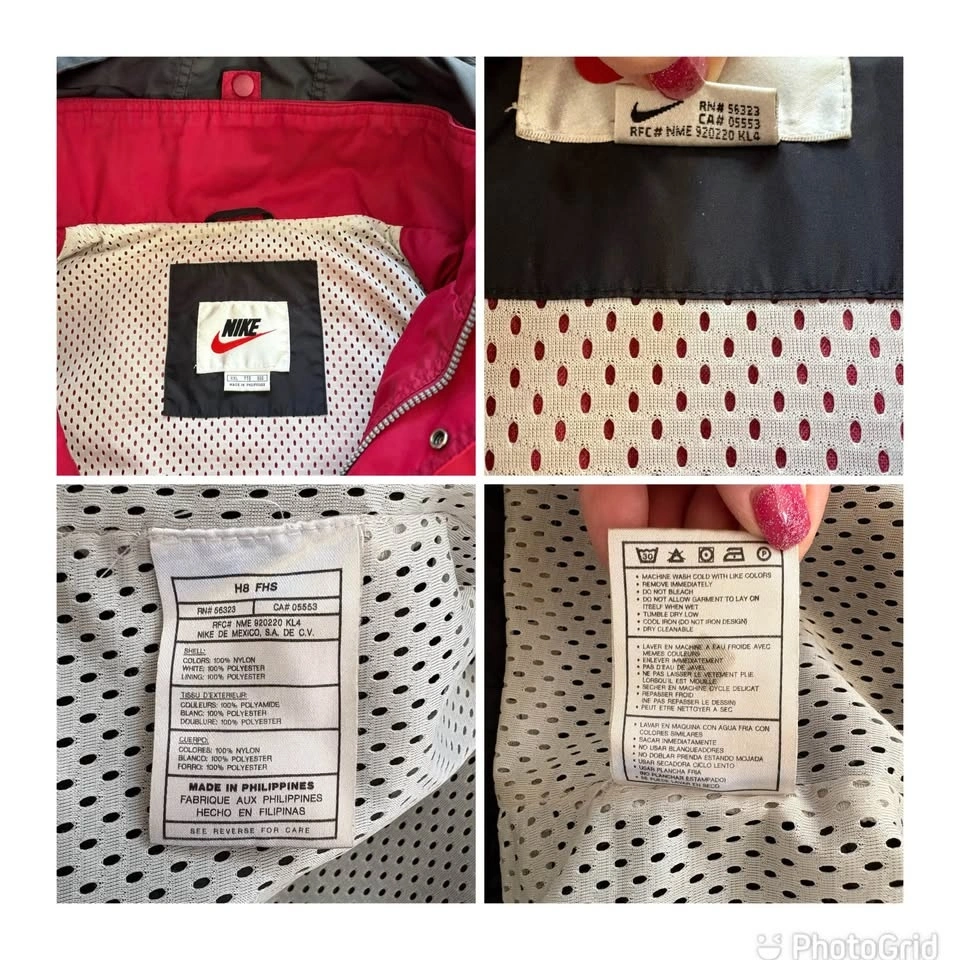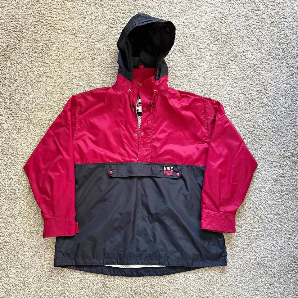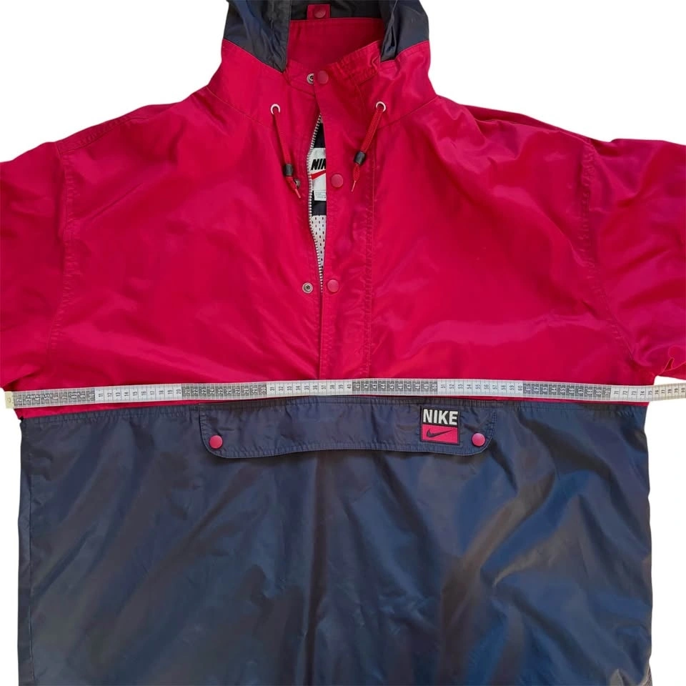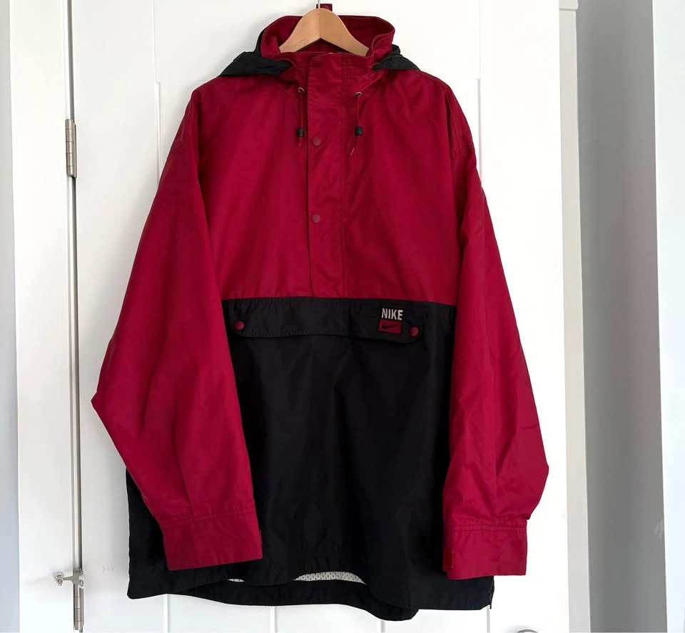 This vintage Nike lightweight track jacket has a packable hood secured with a snap button, and a zipper kangaroo pouch. Red & black with the iconic swoosh logo embroidered on the front. With its retro 80s and 90s style, this vintage Nike jacket is stylish. There are a few faint marks as shown in the photos (back of sleeve and on the back), otherwise in good pre-loved condition.
