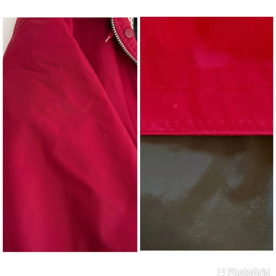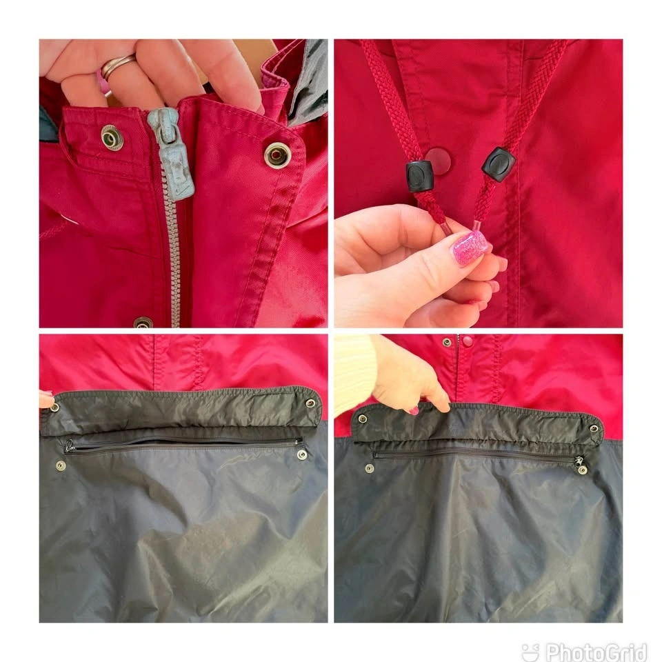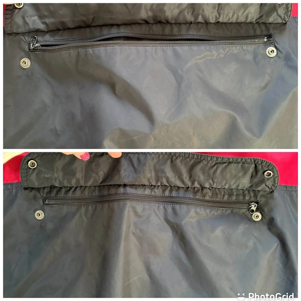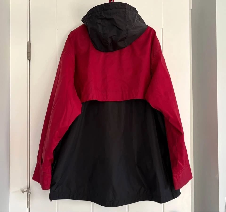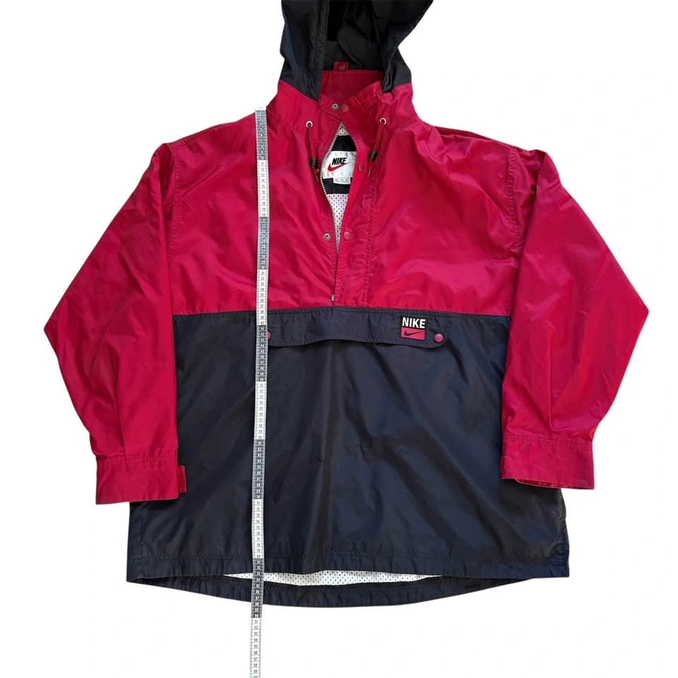 This vintage Nike lightweight track jacket has a packable hood secured with a snap button, and a zipper kangaroo pouch. Red & black with the iconic swoosh logo embroidered on the front. With its retro 80s and 90s style, this vintage Nike jacket is stylish. There are a few faint marks as shown in the photos (back of sleeve and on the back), otherwise in good pre-loved condition.