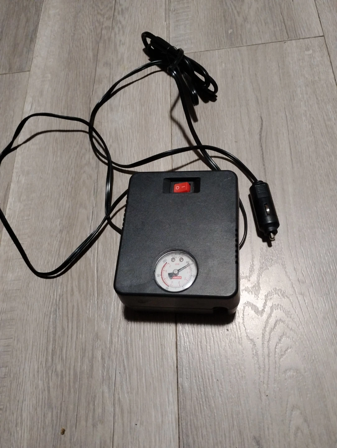 Portable air compressor for car tires. It plugs into a 12V vehicle outlet and has a built-in pressure gauge. Easy to use for on-the-go tire pressure checks and inflation.