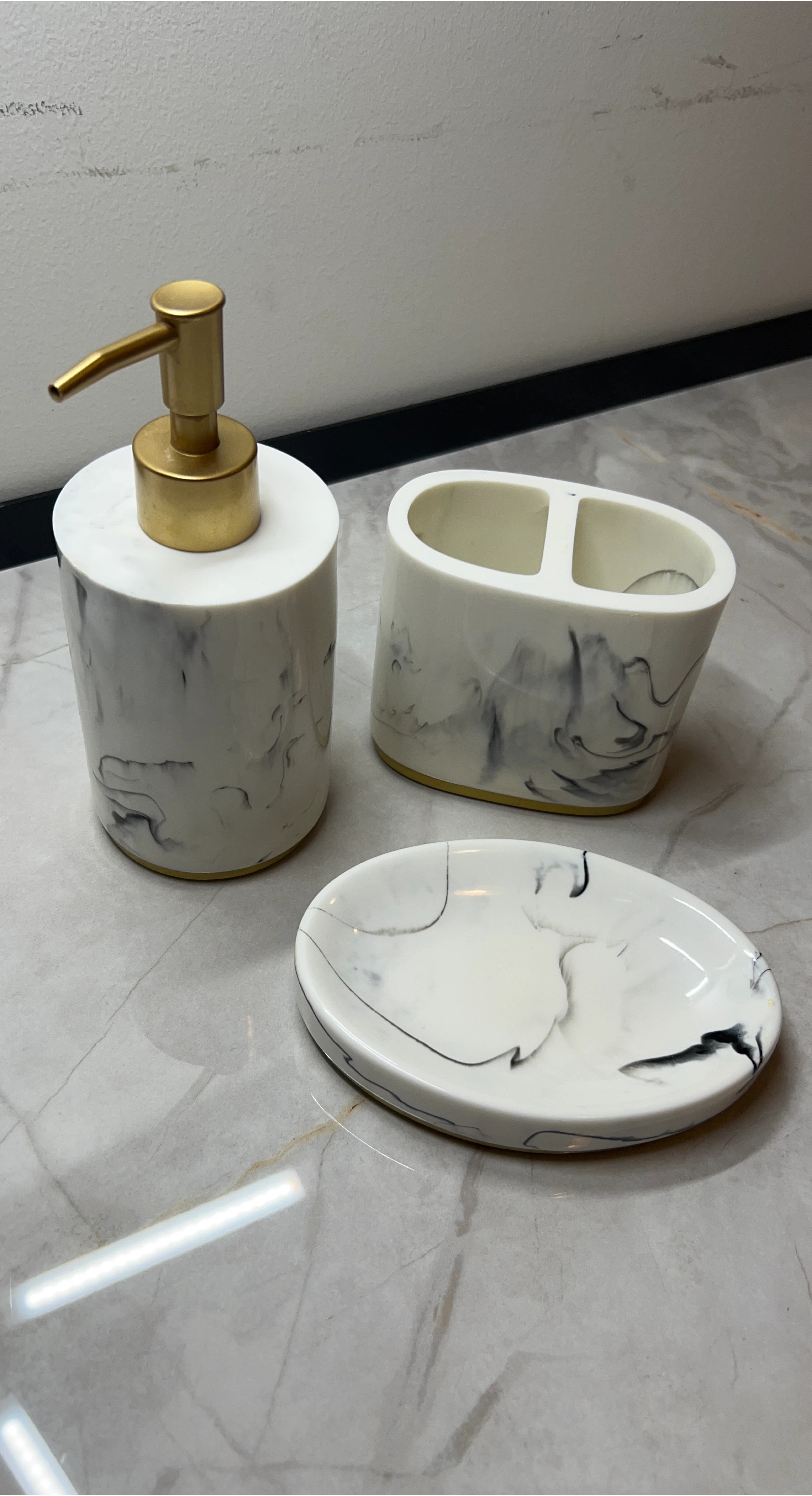 1000+Spruce up your bathroom with this stylish marble-patterned accessory set! Includes a soap dispenser, toothbrush holder, and soap dish. Adds a touch of elegance to any bathroom decor Cash only. Msg to schedule pick up:)