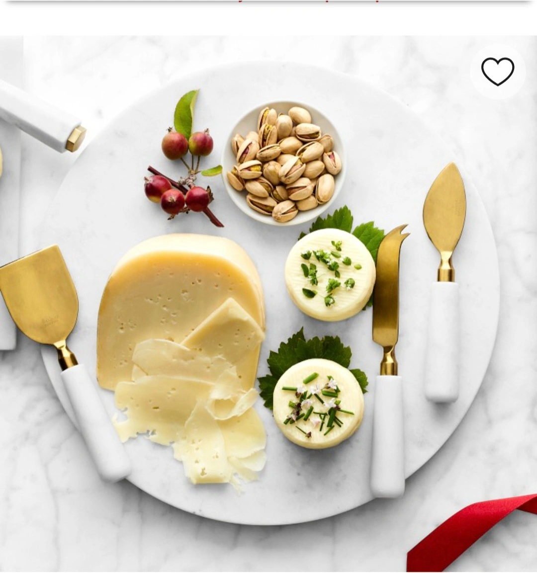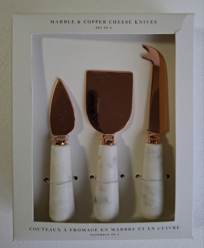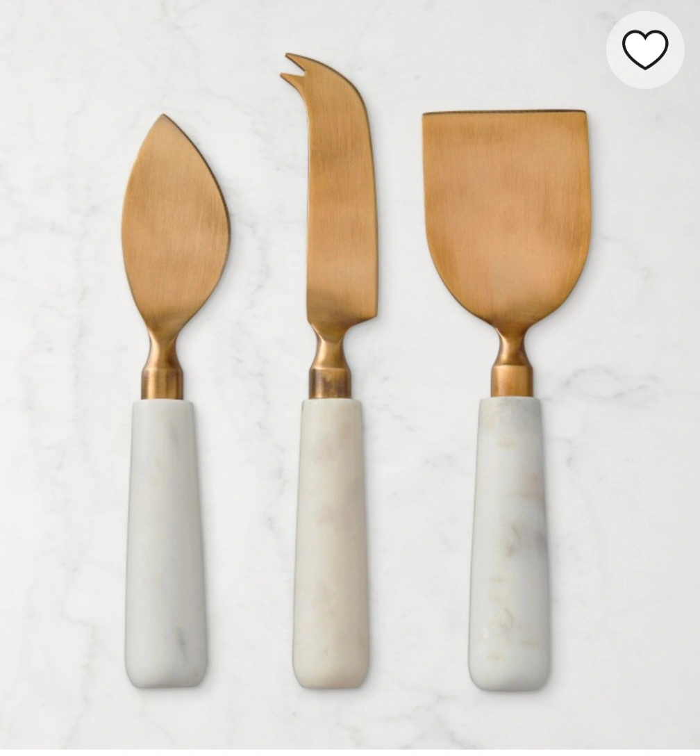 264The elegant cheese knives showcase the rich contrast of white marble and polished brass. Each piece is made by hand, from honing the blades to lathe turning the stone and the marble's natural variations make each knife unique. The versatile design complements wooden cheese boards and ceramic platters equally well. Handles are carved of solid white marble. Durable stainless-steel blades have hand-polished brass. .Set of 3 includes a pronged knife for hard cheese, a tear-shaped knife for soft cheese and a wide blade for semi-hard cheese.