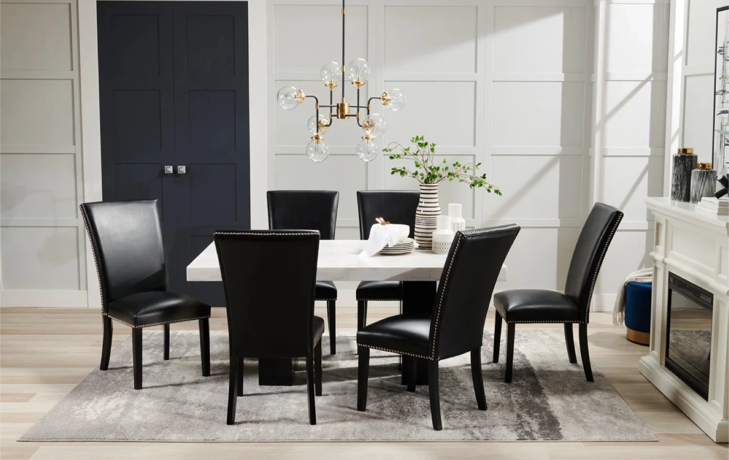 10These dining chairs are in great shape and would look fantastic in any dining room! They feature a sleek black finish and stylish studded detailing. Perfect for adding a touch of elegance to your home. 6 seats.