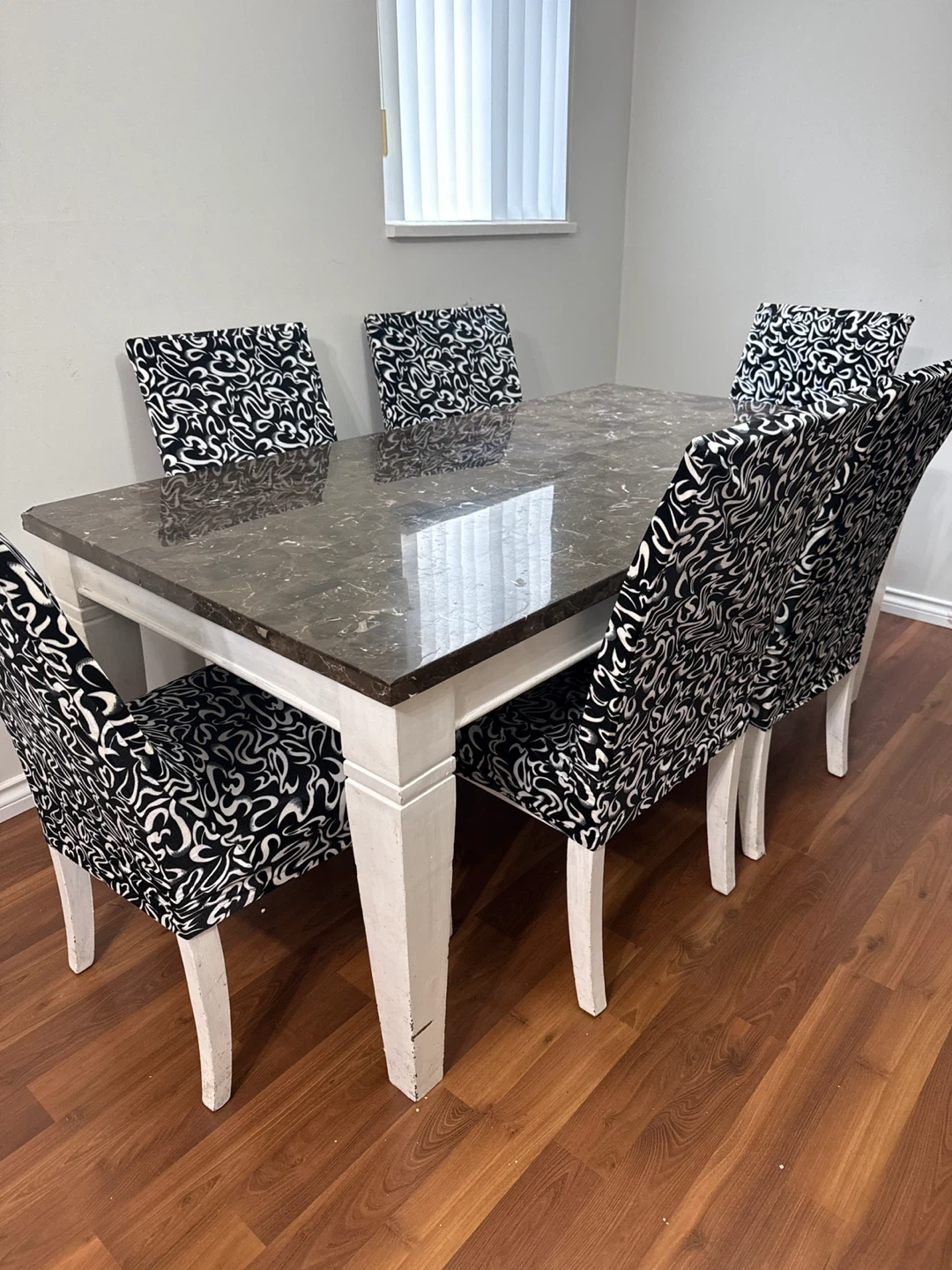 Selling a dining table set that includes six chairs. The table has a dark marble-like top with white legs. The chairs are upholstered in a black and white patterned fabric. It's a great set for family dinners or gatherings!