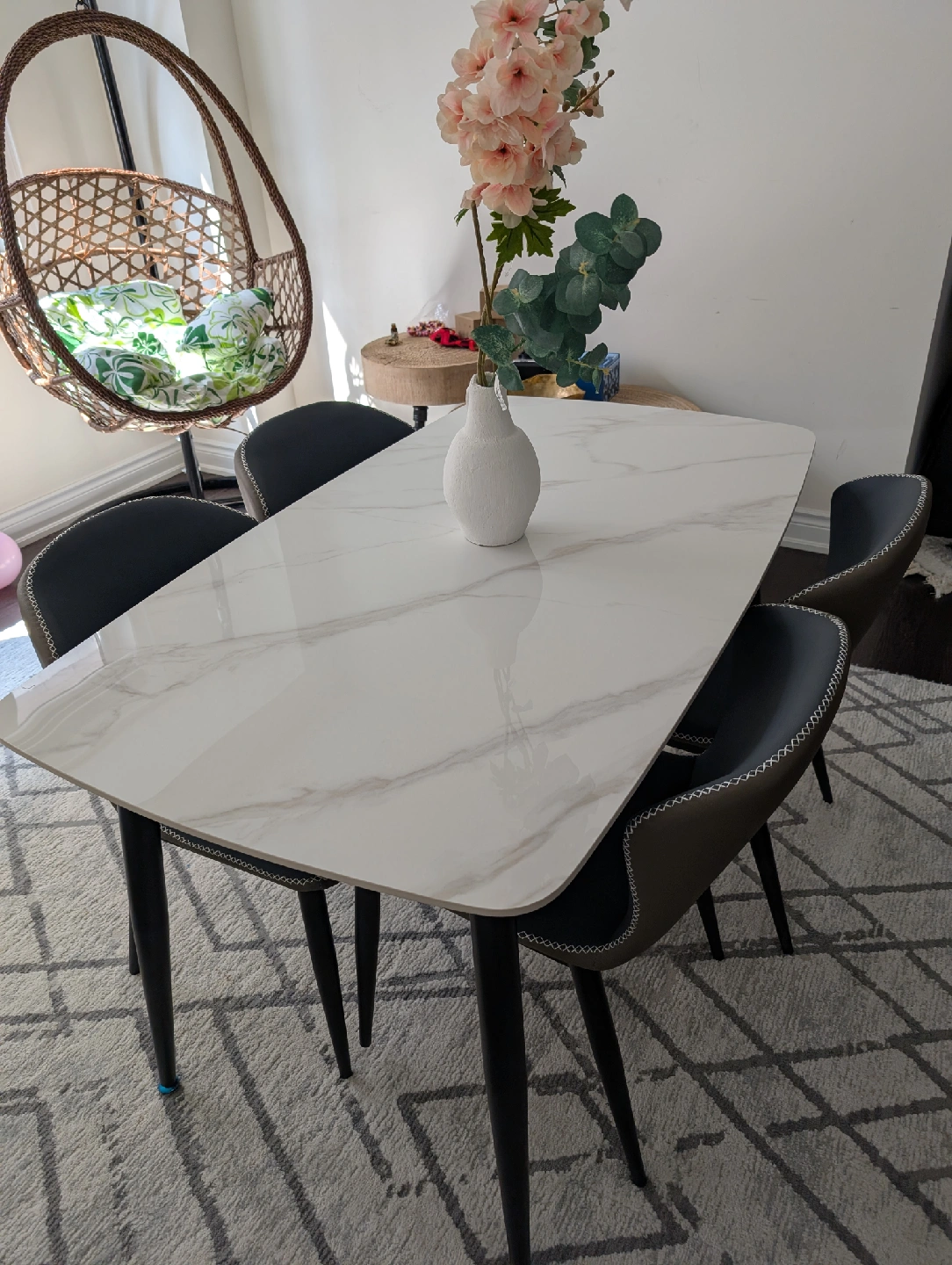 20Selling a beautiful marble dining table complete with four chairs. The table features a sleek marble top and sturdy black legs. The chairs are upholstered in a stylish grey material with a unique stitch pattern. It's a great set to elevate your dining space!