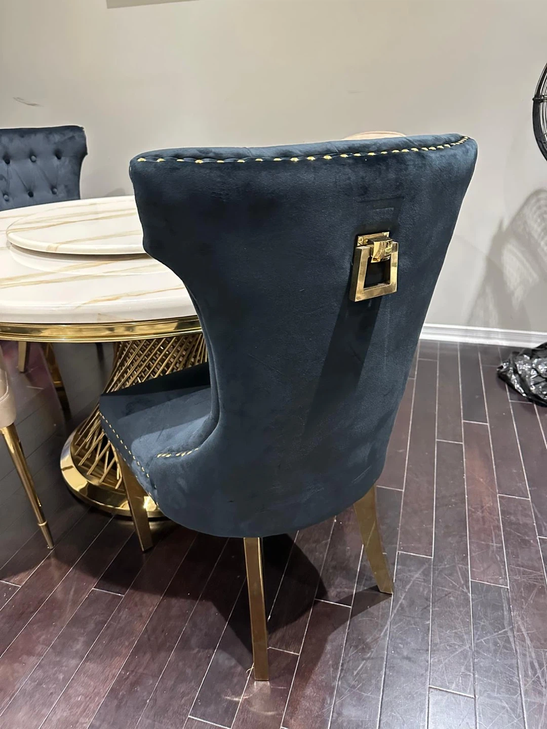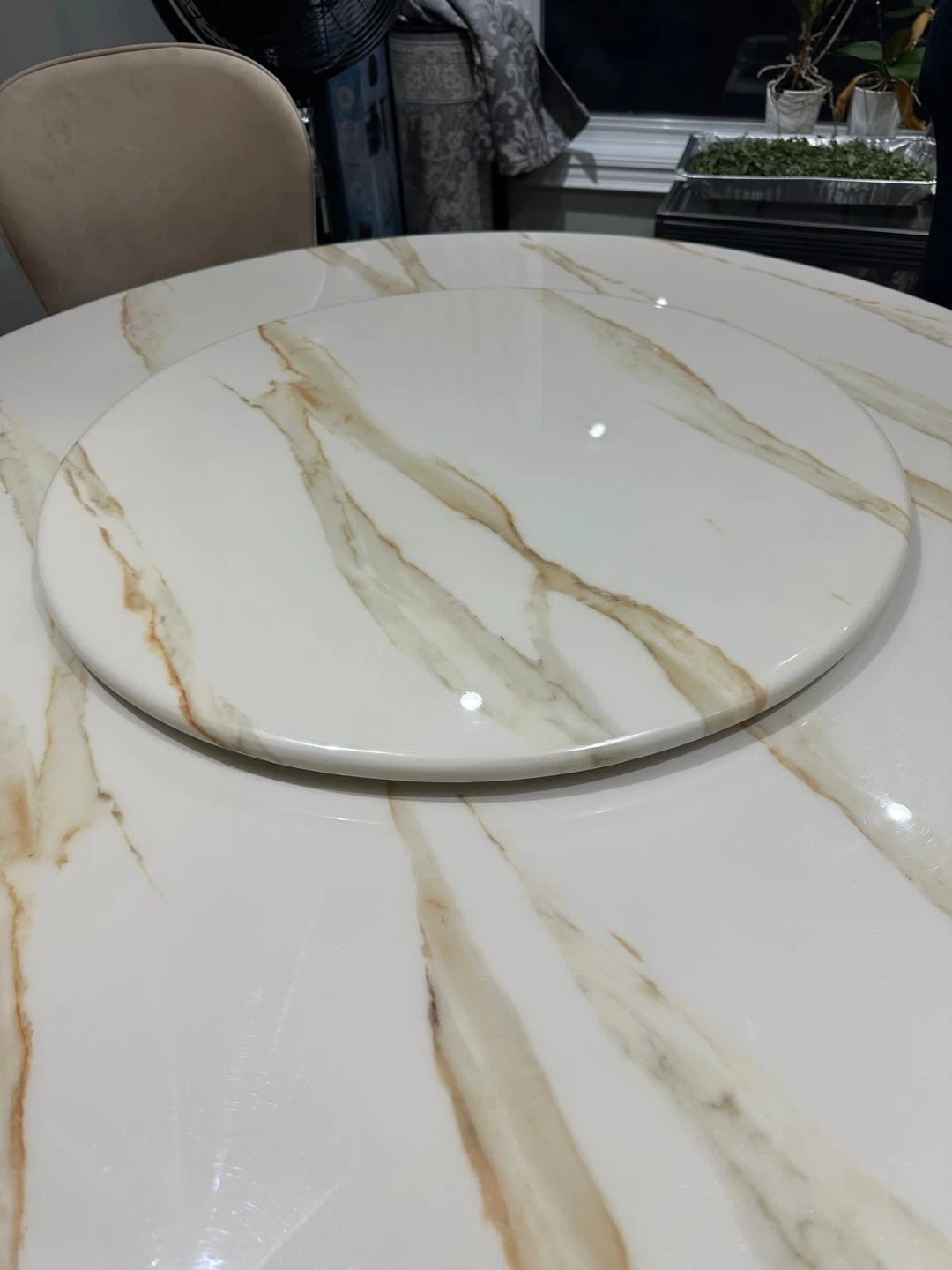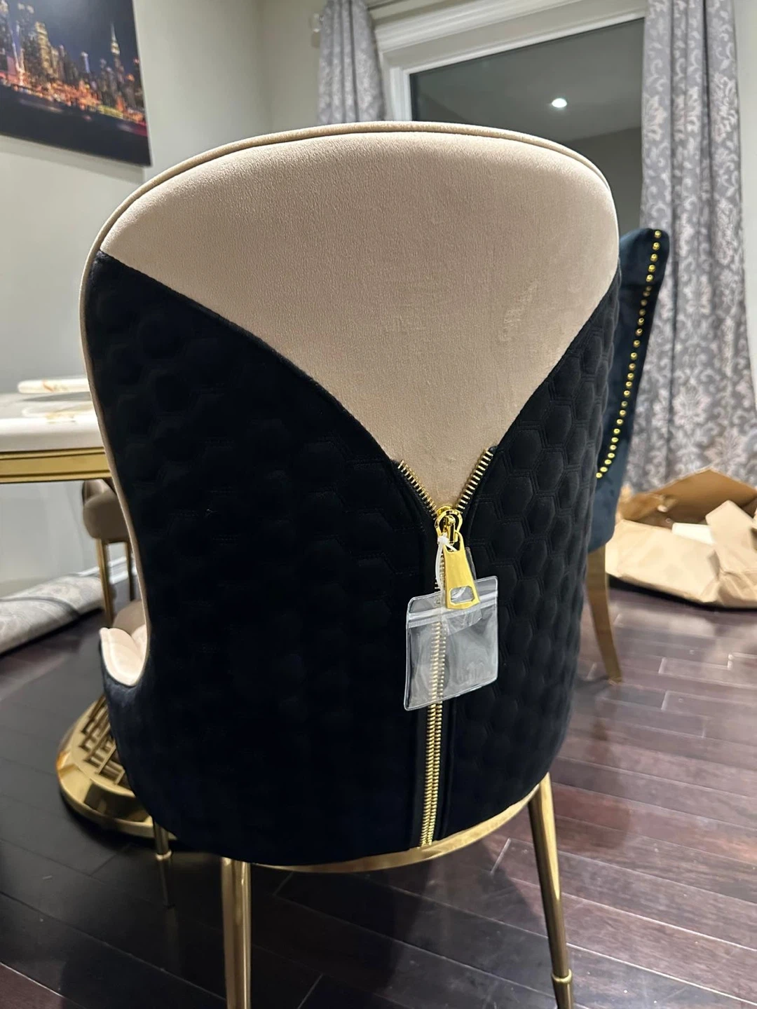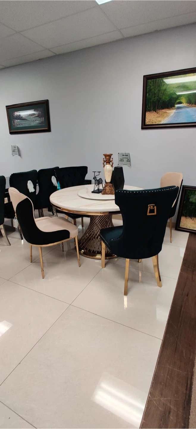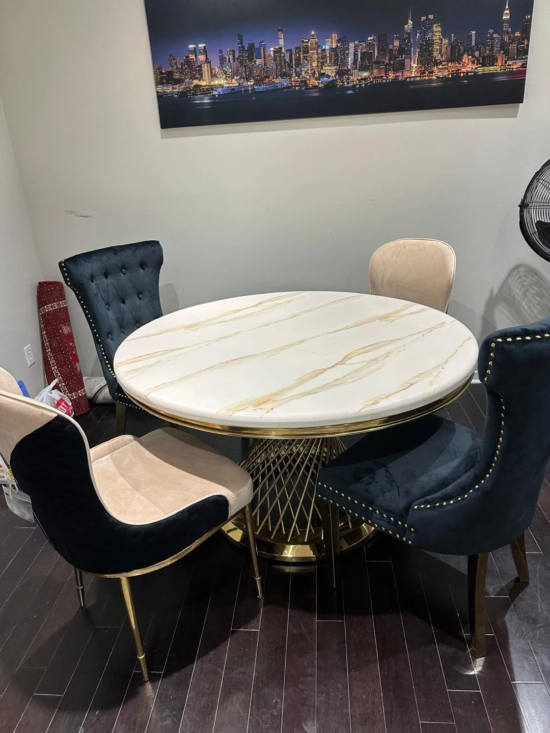 15Selling a beautiful marble dining table with a unique gold base. It comes with four stylish chairs, two in a sleek black and two in a neutral beige. The chairs feature gold accents that complement the table's base perfectly. It's a stunning set that will elevate any dining space!