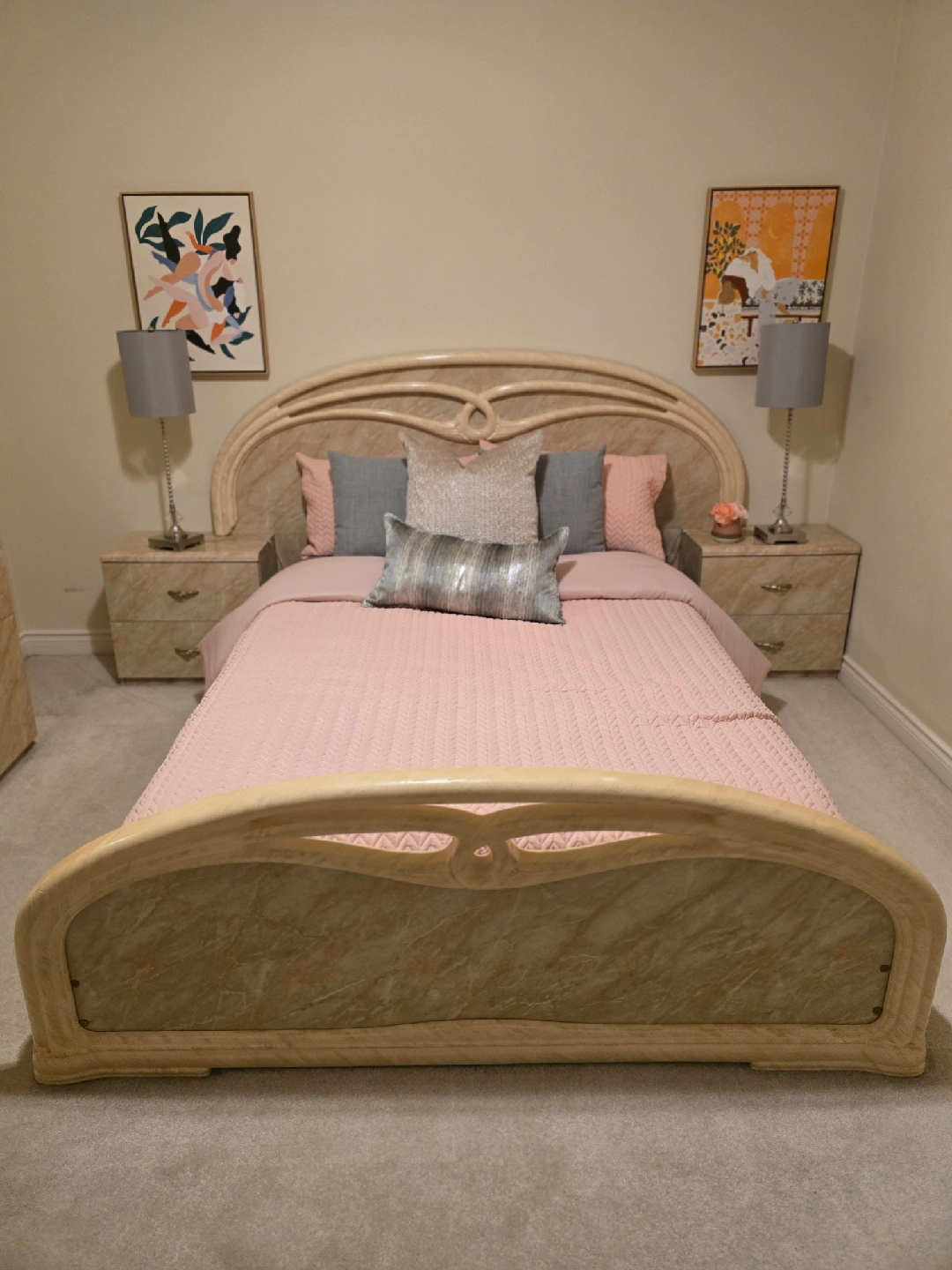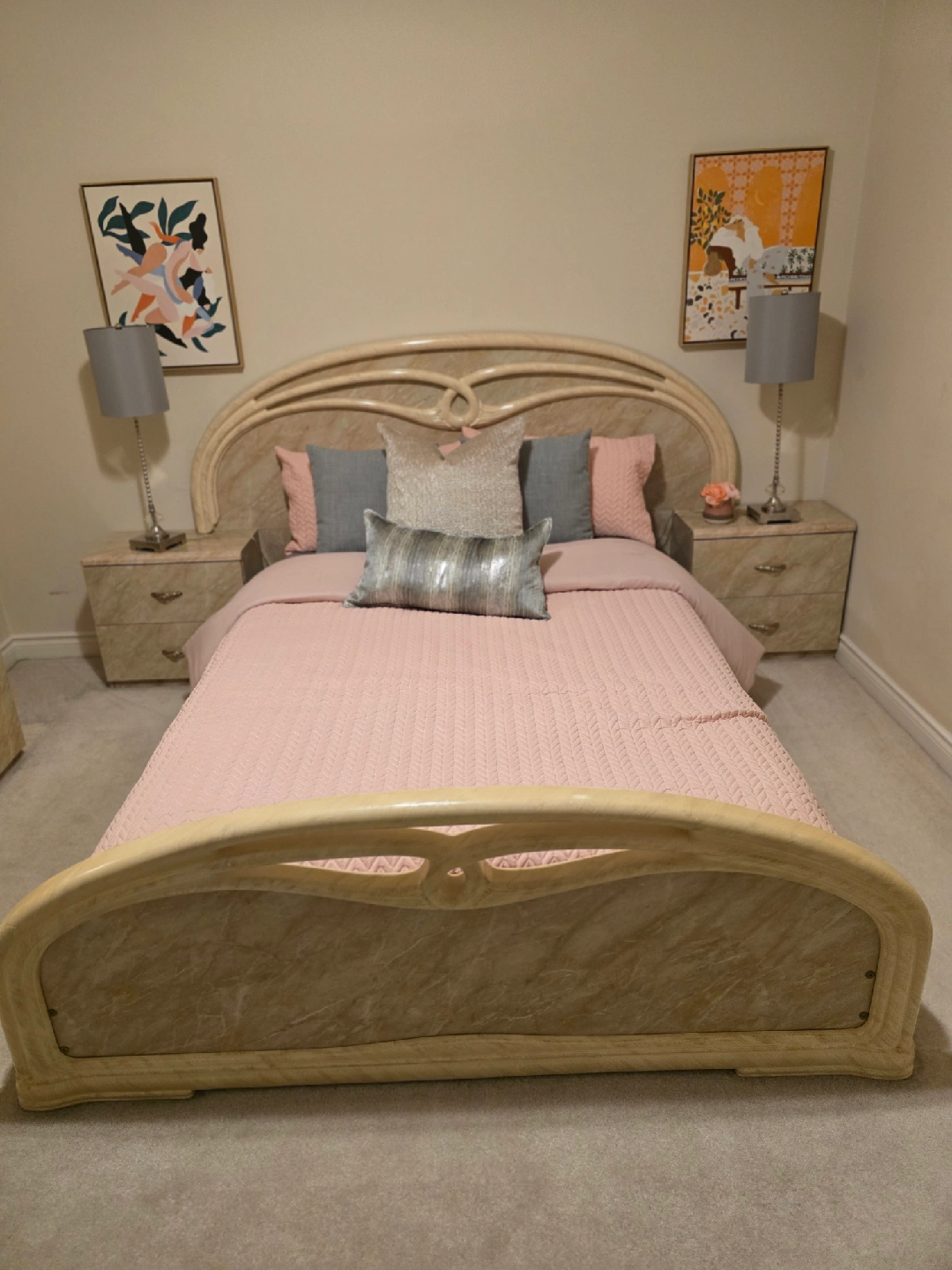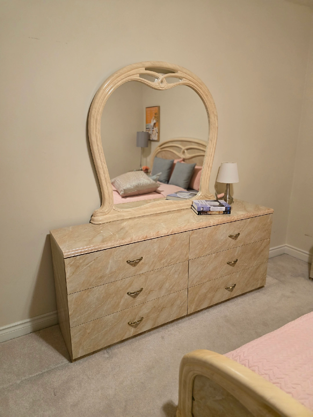 72Giving a new home to a bedroom set that includes a dresser with a mirror, a bed frame, and two night stands and one standing dresser. The set has a unique marble finish, adding a touch of elegance to any bedroom. Great for anyone looking to upgrade their bedroom furniture!