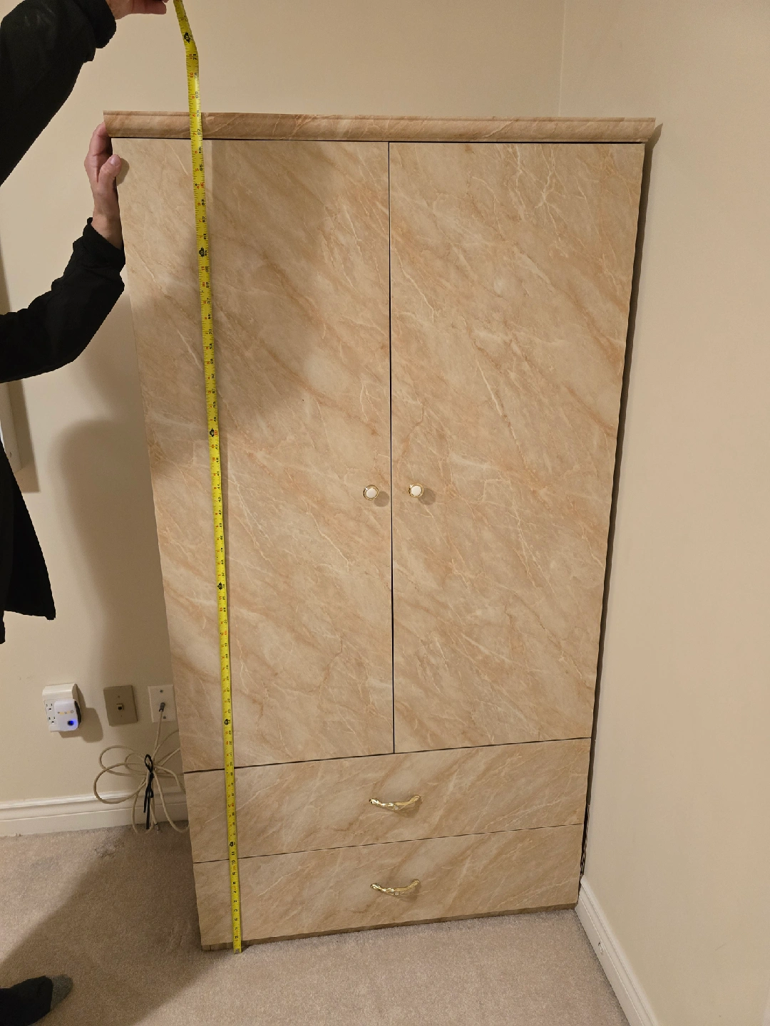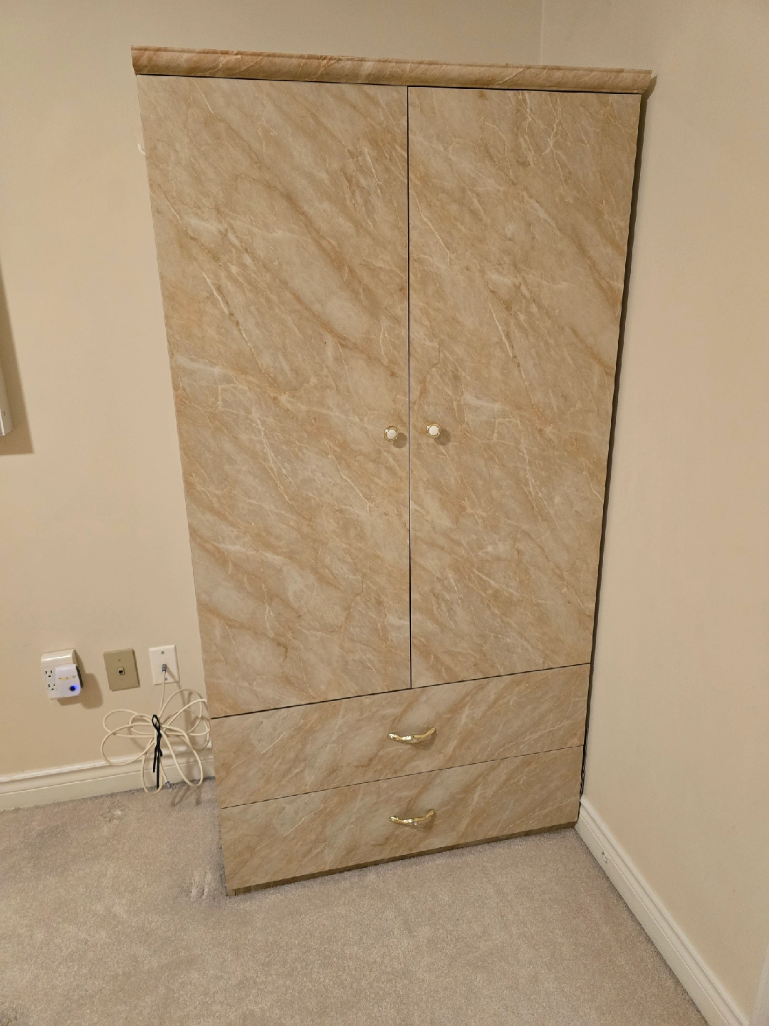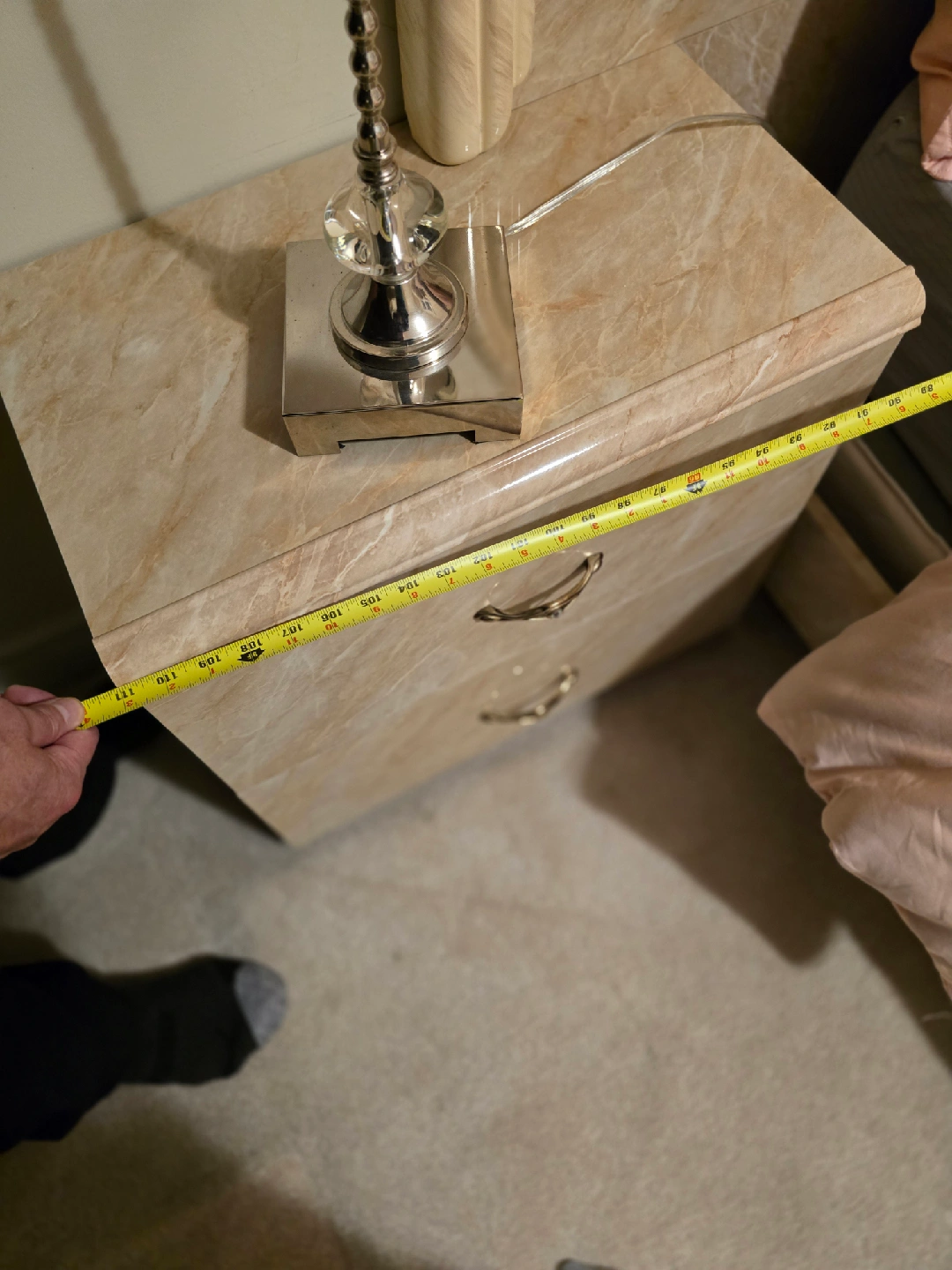 72Giving a new home to a bedroom set that includes a dresser with a mirror, a bed frame, and two night stands and one standing dresser. The set has a unique marble finish, adding a touch of elegance to any bedroom. Great for anyone looking to upgrade their bedroom furniture!