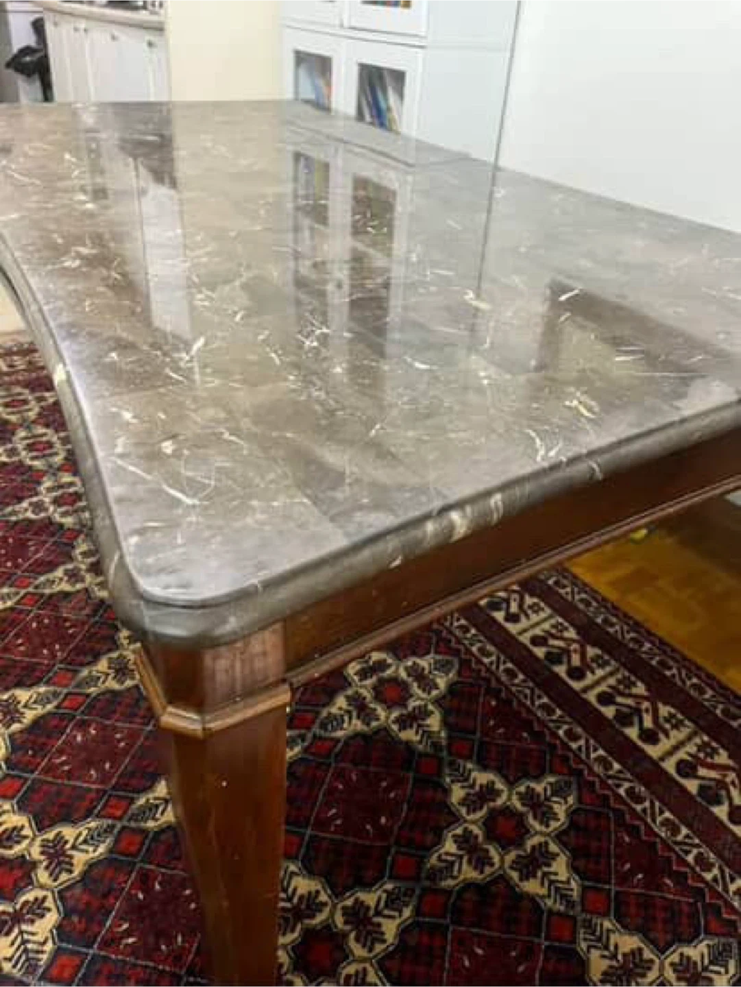 10Selling a dining table with a marble top. It has a unique design with a dark wood frame and legs. The marble has a grey and white veining pattern. It's a solid and sturdy table, perfect for a dining room or kitchen space