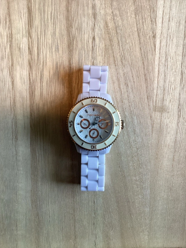 Check out this stylish Marc Ecko women's watch, featuring a crisp white band and eye-catching gold accents on the bezel and dial. This watch combines a sporty aesthetic with a touch of elegance, making it a versatile accessory for any outfit. It’s in great shape and ready to add a bit of flair to your wrist! Specifications: * Brand: Marc Ecko * Band Colour: White * Accent Colour: Gold * Style: Sport Just a heads-up, if you're seeing this ad, the watch is still up for grabs!