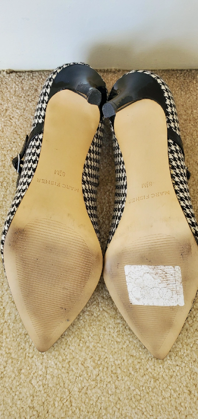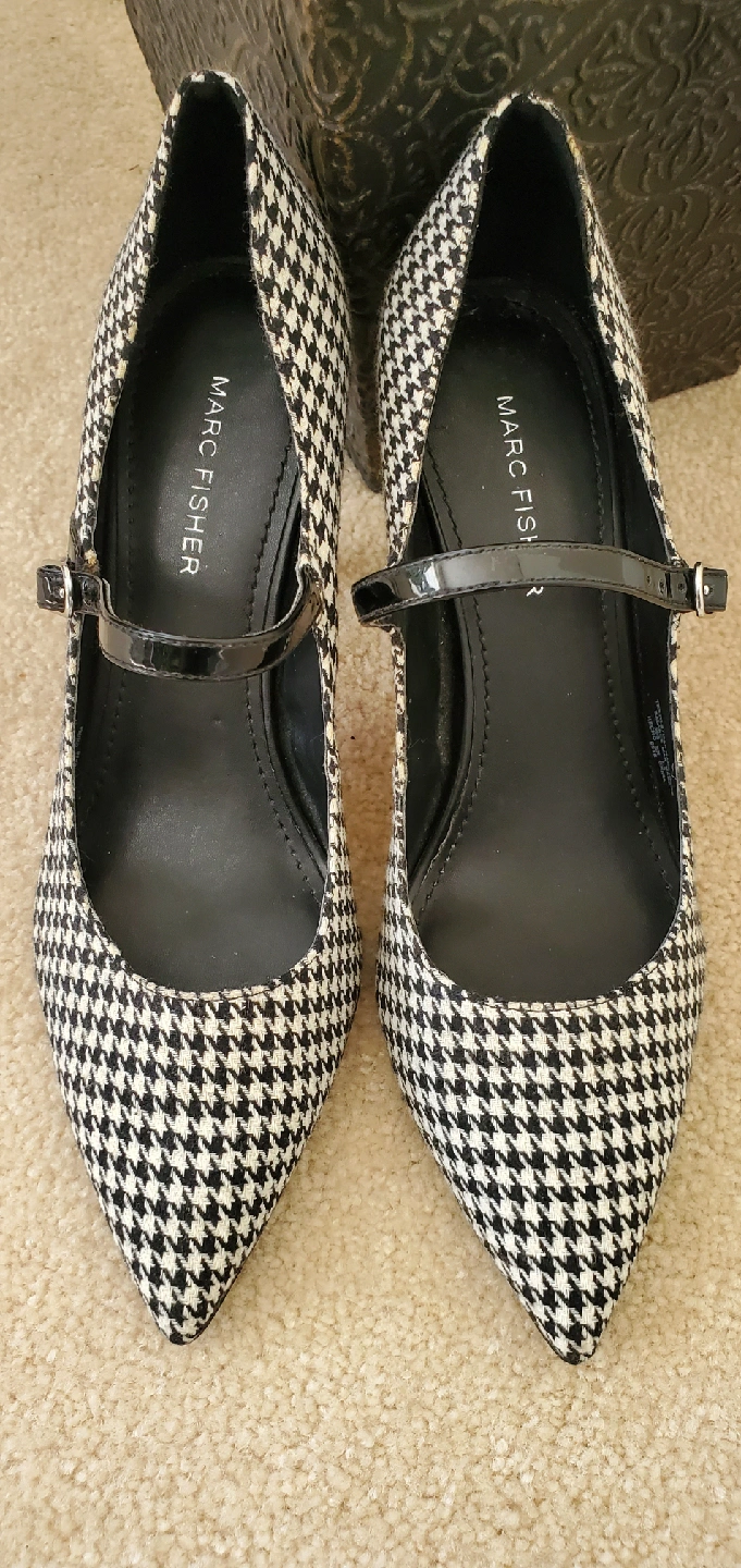 These are a pair of Marc Fisher heels featuring a classic houndstooth pattern! They're a size 8.5M and have a stylish Mary Jane strap. Perfect for adding a touch of sophistication to any outfit! There are some signs of wear on the soles, but overall they're in good condition