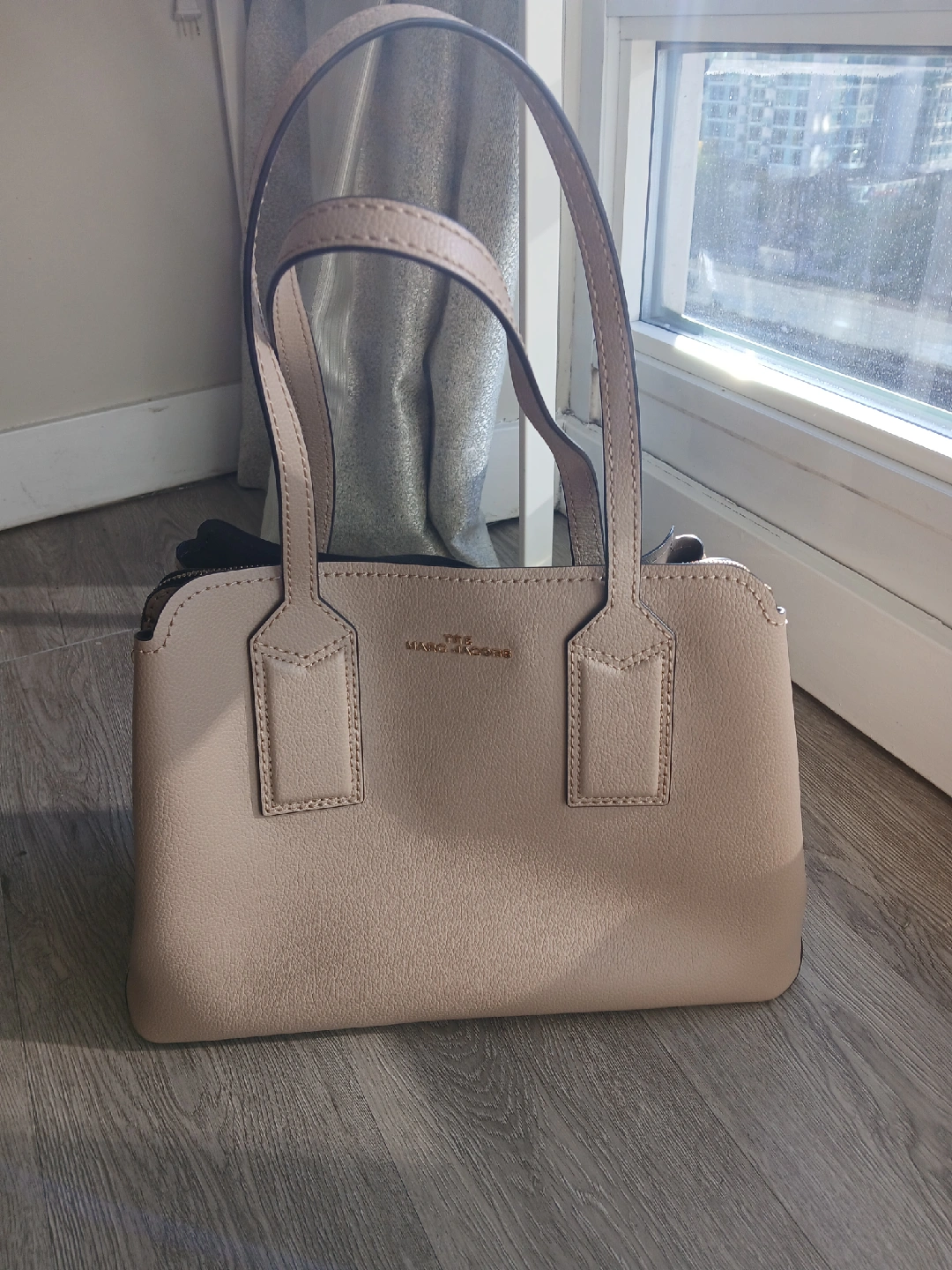 Brand: Marc Jacobs Type: Leather tote bag with zippered middle area, large open areas, and smaller zippered pocket inside. Versatile as it matches with basically any outfit! Colour: beige Additional measurements: base is about 36 cm long x 13 cm wide, height is about 22 cm tall Composition / material: split cow leather with a PU coating Condition: Excellent. Like new, just some minor marks on the bottom of the inside. (Very minor and not noticeable when worn