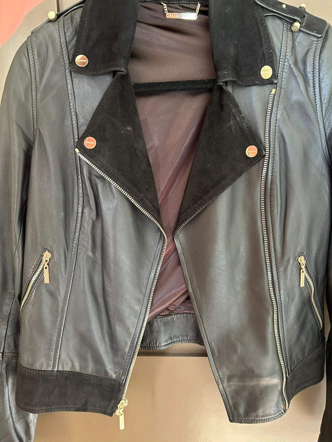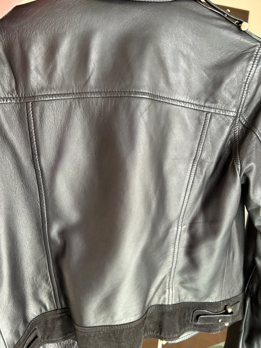 Step out in style with this premium 100% leather jacket, crafted for those who love quality and elegance. Its soft suede collar adds a touch of sophistication, while the tailored small fit flatters your silhouette perfectly. Features: * Real, high-quality leather – durable and smooth * Suede collar for a stylish contrast * Lightweight and comfortable fit * Perfect for everyday wear or a night out This piece combines classic charm with modern edge— a wardrobe essential that never goes out of style. Condition:Excellent – barely worn, looks new! Size:Small Don’t miss out — grab this luxury piece before it is gone.